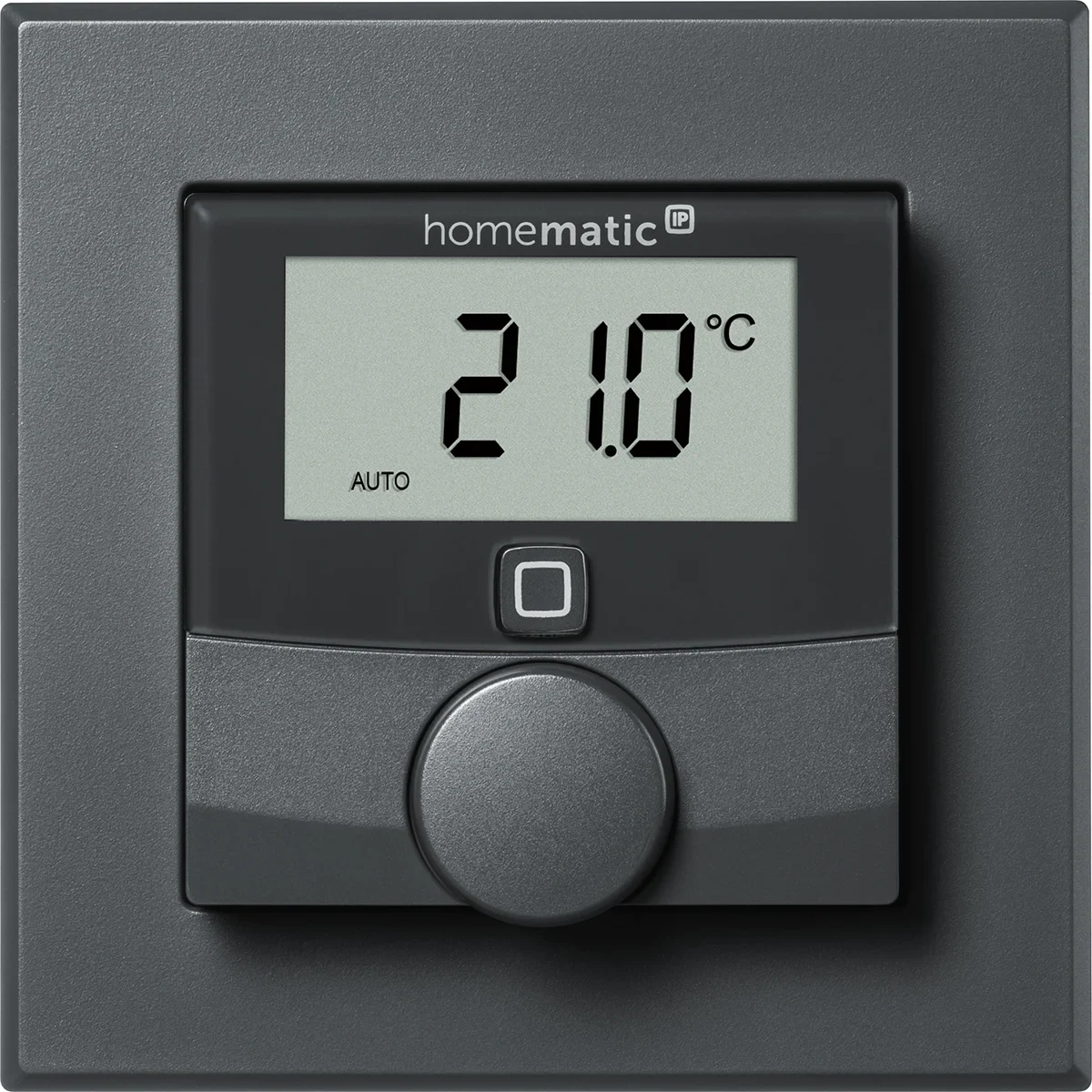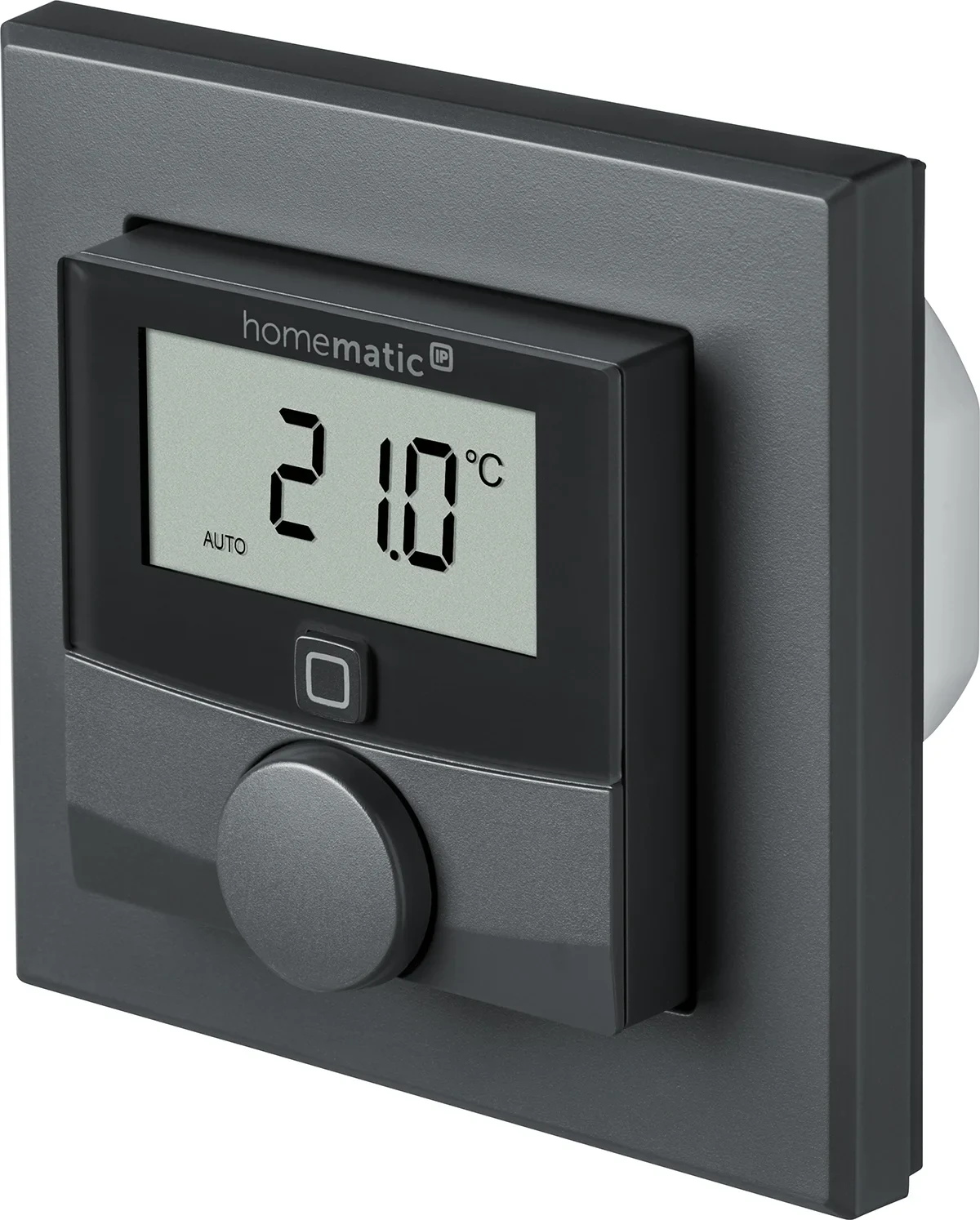 Der Homematic IP Wandthermostat mit Schaltausgang in Anthrazit ist Teil des Homematic IP Smart-Home-Systems und steuert 230 V-Fußbodenheizungsstellantriebe per Relais-Ausgang. Der Wandthermostat mit Schaltausgang ermöglicht somit das einfache Aufrüsten einer konventionellen Fußbodenheizungssteuerung zu einer intelligenten Regelung der Raumtemperatur durch Austausch des bisherigen Bimetall-Reglers. Dies steigert den Wohnkomfort und hilft aktiv beim Energiesparen. Die smarte Lösung bietet individuelle Temperaturverläufe mit bis zu 13 Änderungen pro Tag in 3 bzw. 6 einstellbaren Heizprofilen (3x Heizen/3x Kühlen). Über den Homematic IP Wandthermostat mit Schaltausgang lässt sich die Soll-Temperatur in 0,5 °C-Schritten bequem per Einstellrad wählen. Das große beleuchtete Display zeigt die Soll- und Ist-Temperatur wie auch die Luftfeuchtigkeit an. Darüber hinaus können alle Werte auch per Homematic IP App abgelesen und eingestellt werden. Der Wandthermostat wird in klassische Unterputzdosen montiert, was den Austausch bestehender Wandthermostate deutlich erleichtert. Die Abmessungen des Homematic IP Wandthermostats erlauben dabei sogar die Integration in Mehrfachrahmen der führenden Hersteller. Soll der Thermostat ohne den Homematic IP Access Point bzw. ohne die Zentrale CCU2/CCU3 genutzt werden, können die gewünschten Einstellungen direkt am Thermostat ohne Smart-Home-Anbindung gewählt werden. Weiterführende Produktinformationen gibt es unter www.homematic-ip.com. Im Download-Bereich ist ein ausführliches Anwenderhandbuch zum Homematic IP System zu finden. Produkteigenschaften: Individuelle Steuerung von 230 V-Stellantrieben für Fußbodenheizungen über Relais-Ausgang entsprechend der festgelegten Heizprofile. Ermöglicht die einfache Aufrüstung einer konventionellen Fußbodenheizungssteuerung zur intelligent gesteuerten Regulierung des Raumklimas per Smartphone durch Austausch des bestehenden Wandthermostats. Messung und Anzeige von Soll- und Ist-Temperatur sowie der Luftfeuchtigkeit auf großem beleuchtetem Display. Individuelle Temperaturverläufe mit bis zu 13 Änderungen pro Tag in 3 bzw. 6 einstellbaren Heizprofilen (3x Heizen/3x Kühlen). Für den Betrieb ist eine der folgenden Lösungen erforderlich: Stand-alone (ohne Access Point oder Zentrale in Kombination mit einem Fußbodenheizungsaktor