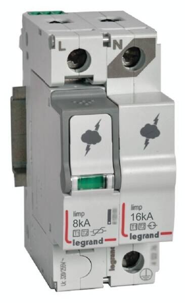 Legrand Kombiableiter Typ 1+2/Class I+II nach IEC/EN 61643-11, 1+1 Schaltung, für TT und TN-S Systeme, Nennspannung 230/400 VAC, Blitzstoßstrom Iimp(10/350) 8 kA/Pol. Höchste Dauerspannung (Uc) 320 VAC. Zum Schutz vor Überspannungen nachgeordneter Verbraucher durch indirekte Blitzeinschläge, Schalthandlungen und Freileitungseinspeisung. Mit Plug-in Schutzmodul und Statusanzeige: Grün(SPD betriebsbereit) Orange (Plug-in Schutzmodul austauschen).