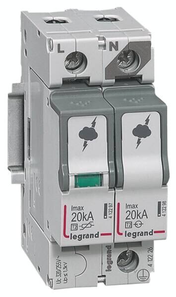 Legrand Überspannungsableiter Typ 2/Class II nach IEC/EN 61643-11, 1+1 Schaltung, für TT und TN-S Systeme, Nennspannung 230/400 VAC, Ableitstoßstrom Imax (8/20) 20 kA/Pol. Höchste Dauerspannung (Uc) 320 VAC. Zum Schutz vor Überspannungen nachgeordneter Verbraucher durch indirekte Blitzeinschläge oder Schalthandlungen. Mit Plug-in Schutzmodul und Statusanzeige: Grün(SPD betriebsbereit) Orange (Plug-in Schutzmodul austauschen).