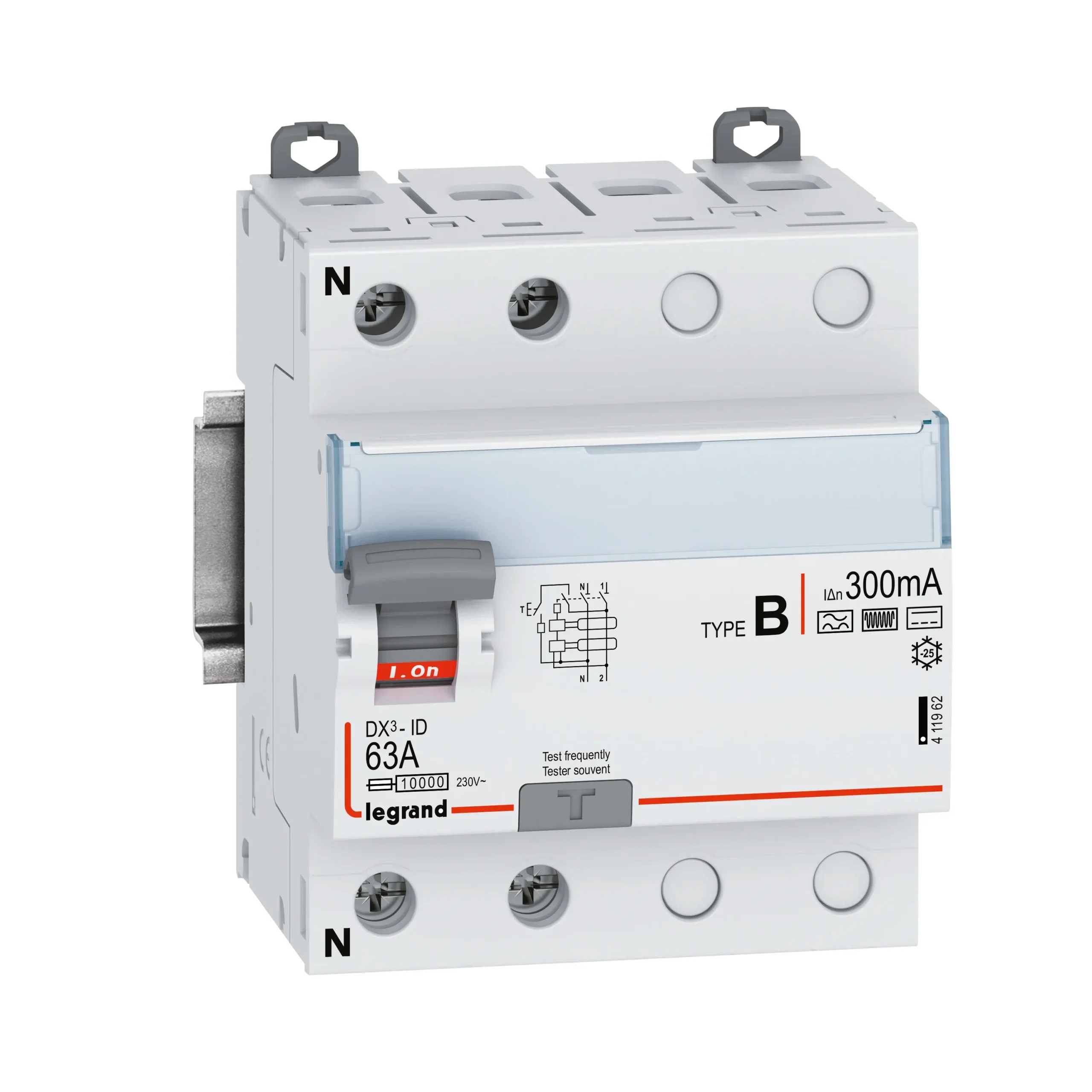 Legrand Fehlerstromschutzschalter DX3-ID, Typ B, allstromsensitiv, für Wechsel-, pulsierende und glatte Gleichfehlerströme, nach VDE 0664-10, VDE 0664-11, VDE 0664-40, EN 61008-1, EN 61008-2-1, EN 62423, Erfassung von Fehlerströmen im Frequenzbereich 0 Hz bis 1kHz, kurzzeitverzögert, mit hoher Auslöseschwelle für erhöhte Betriebssicherheit (vermindert Fehlauslösungen), 2-polig, Bemessungsstrom In 63 A, Bemessungsfehlerstrom Idn 300 mA, Bemessungsspannung Un 230 VAC, Bemessungsfrequenz 50 Hz, Bemessungskurzschlussstrom 10 kA bei geeigneter Vorsicherung, Stoßstromfest bis 3000 A, 4-modulig, Befestigung auf Hutprofilschiene EN 60715 durch Schnellbefestigung, klare Information vorne auf jedem Gerät, eindeutige Schaltstellungsanzeige rot/grün am Schalthebel, mit Beschriftungsfenster, mit Untersteckschutz zum sicheren Einführen des Leiters in Fahrstuhlklemme, Anbau von Hilfsgeräten möglich. Neutralleiter-Anschluss links. Einsatz und Verwendung von allstromsensitive Fehlerstromschutzschaltern für gewerbliche und industrielle Installationen mit TT, TN-S und TN-C-S Systemen, in denen Betriebsmittel der Leistungselektronik ohne galvanische Netztrennung zur Anwendung kommen, wie zum Beispiel Anlagen mit Frequenzumrichtern. Anwendungsbereiche sind: Photovoltaik-Anlagen/ Pumpen-, Klima- und Lüftungsanlagen/ Rolltreppen und Fahrstuhlanlagen/ Medizinische Geräte/ Schweißanlagen/ USV-Anlagen/ Unterrichtsräume mit Experimentiereinrichtungen/ Baustellen mit Baustromverteiler zum Anschluss von z.B. Kränen/ Fahrgeschäfte von Schaustellern.