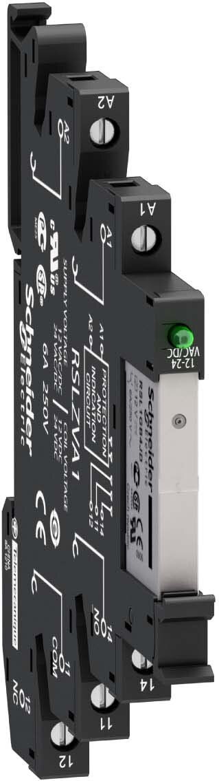 Zelio Relay. Vormontierte schmale Interface-Relais RSL. Relais mit 1 Wechslerkontakt, Standardkontakt. Steuerspannung 230 VAC/DC. Kontakt bis 6 A belastbar. Baubreite 6,2 mm. Anschlüsse Schraubklemmen, Aufnahme von Kammschienen vorhanden. LED-Anzeige, Spannungsanpassung und Schutz im Sockel integriert. Hebel zum problemlosen Einrasten und Entnahme des Relais. Aufnahme am Sockel für Beschriftungsschild. Sockel aufrastbar auf Hutschiene. Das Relais ist bereits im Sockel gesteckt und kann sofort montiert werden.