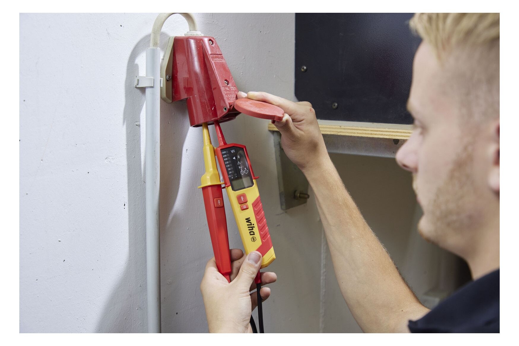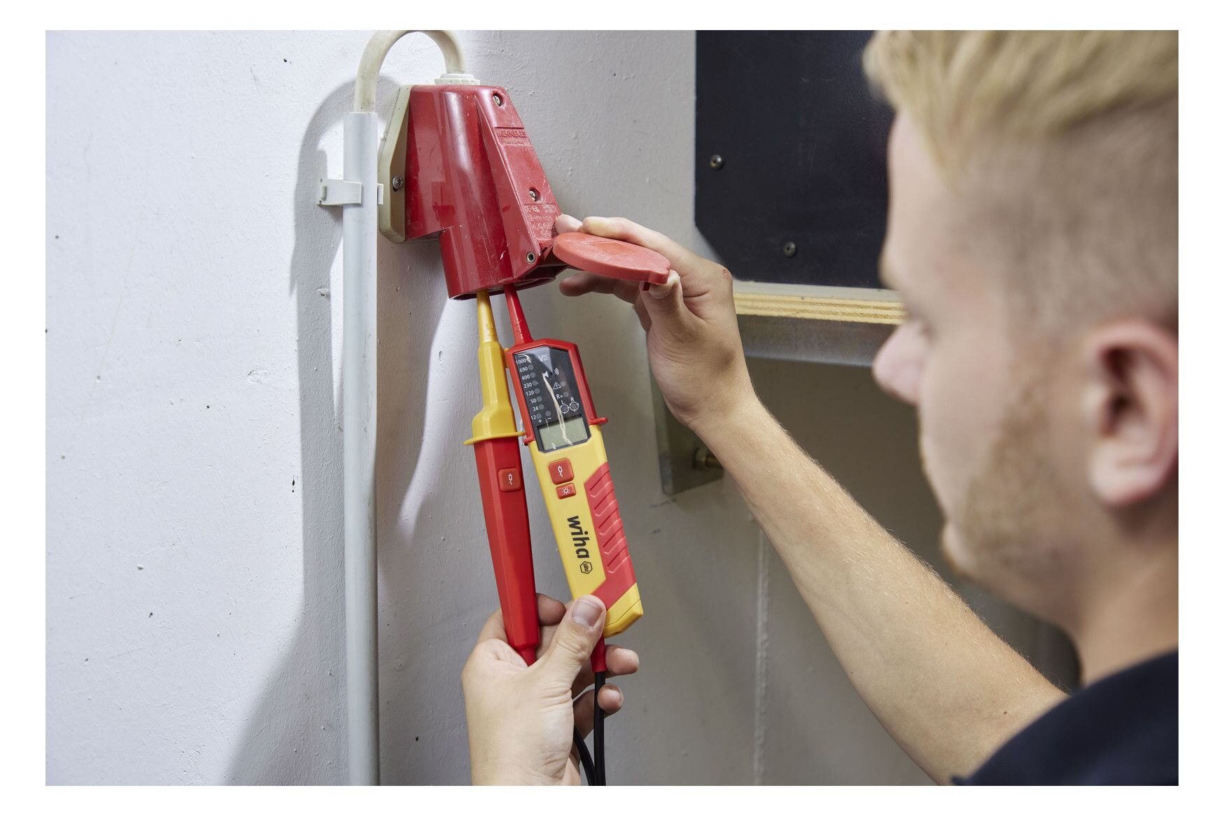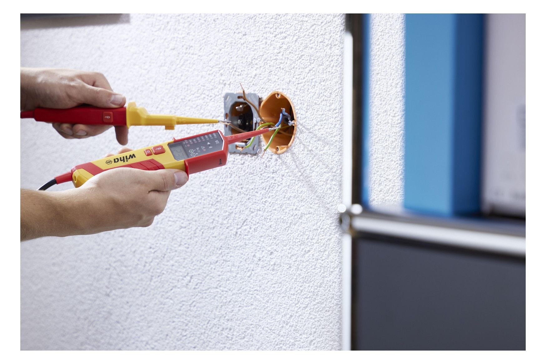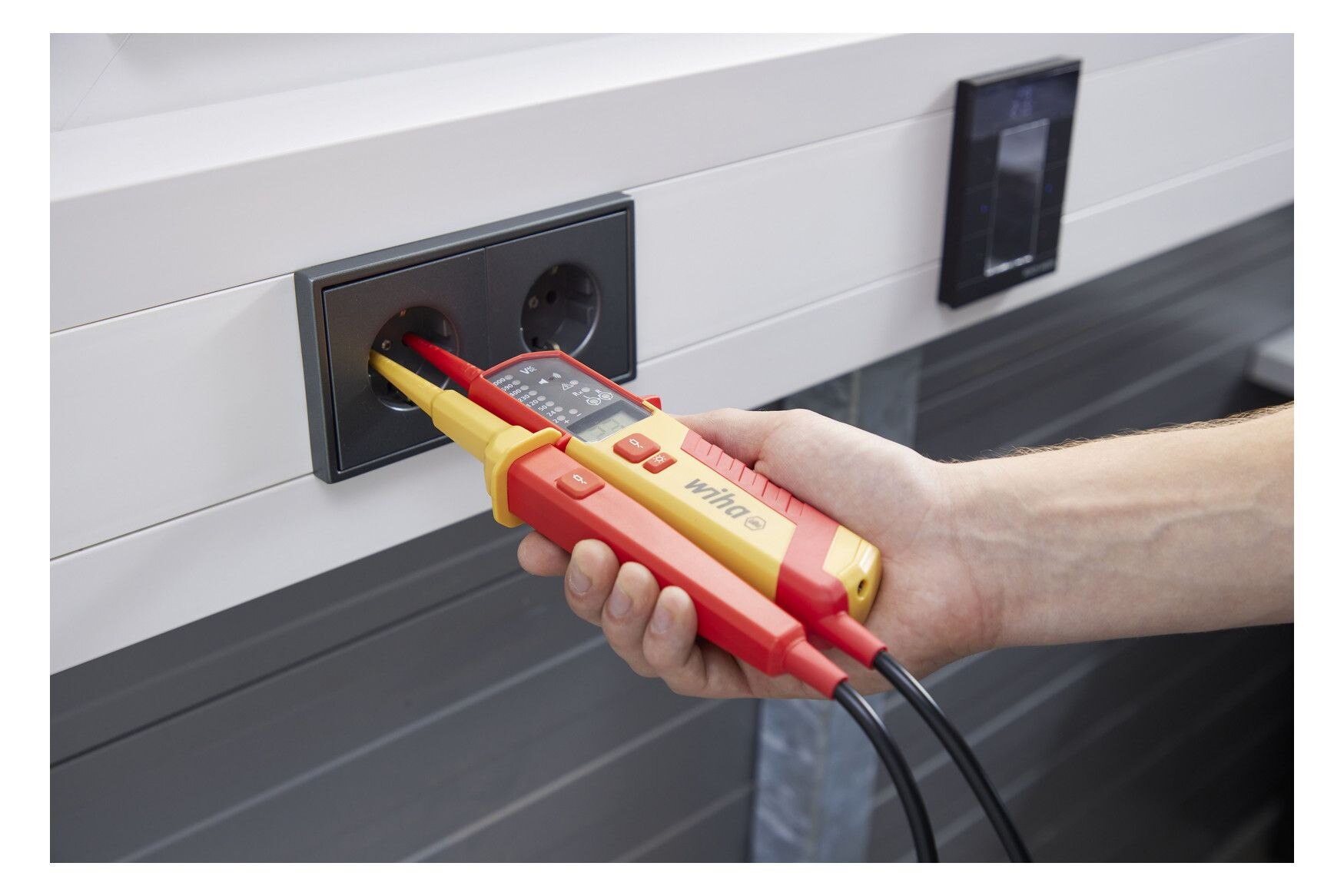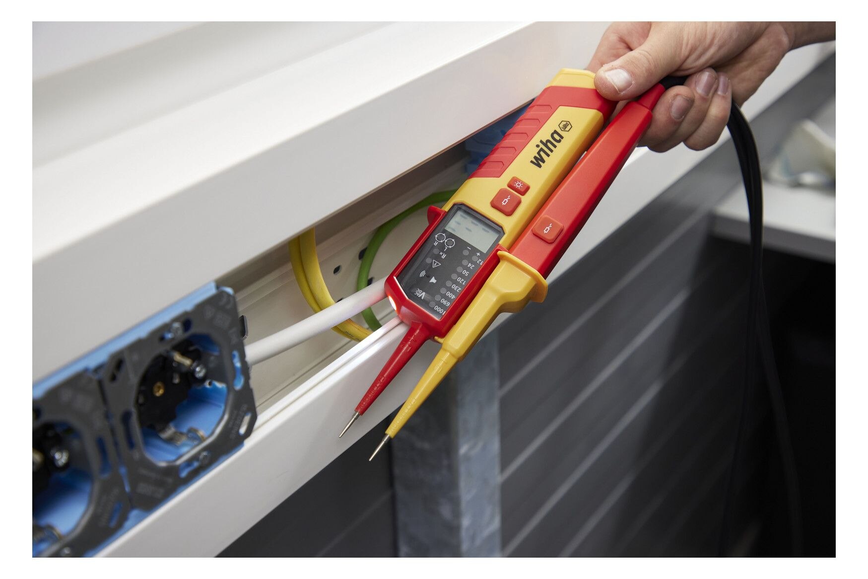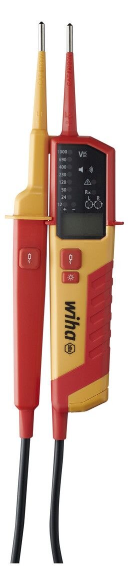 Erhöht Ihre Flexibilität: Deckt den relevanten Spannungsbereich für Arbeiten eines Elektrikers ab. Vereinfacht Ihre Arbeit: Grose LCD-Anzeige mit Hintergrundbeleuchtung, LED-Skala und Signalton für einfach ablesbare Messergebnisse. Vereinfacht Ihre Arbeit: Eine integrierte Taschenlampenfunktion sorgt für optimale Lichtverhältnisse. Erfüllt Ihre Ansprüche: Überprüfung der FI-Auslösung durch zwei Lasttasten. Mase: 240 x 75 x 30 mm Anwendung: Zum Feststellen von Spannungsfreiheit. Anwendung: Zur normgerechten Spannungsprüfung, Durchgangsprüfung, Drehfeldprüfung und Widerstandsmessung inkl. FI-Schutzschalter Auslösung. Messkategorie: CAT III 1.000 V . CAT IV 600 V Normen: Photovoltaik geeignet 0,5 - 1.000 V AC . 1.500 V DC CAT III 1.000 V . CAT IV 600 V Einhandprüfung Drehfeldmessung FI-Lasttasten Sicherheitsregel: Spannungsfreiheit feststellen! Der Spannungs- und Durchgangsprüfer von Wiha ist ihr idealer täglicher Begleiter um diese Voraussetzung der Sicherheitsregel einfach zu prüfen und Sie bei vielfältigen Anforderungen in Ihrem Berufsalltag zu unterstützen. Er ermöglicht eine Spannungsprüfung für einen umfangreichen Messbereich von 0,5V bis 1.000 V AC bzw. 1.500 V DC. Zusätzlich bietet der Spannungsprüfer die Möglichkeit der Durchgangsprüfung, der optischen Drehfeldprüfung, der Einpolprüfung sowie der automatischen Polaritätserkennung. Darüber hinaus können Widerstandsmessungen und Frequenzmessungen durchgeführt werden. Die Messergebnisse sind dank einer grosen digitalen LCD-Anzeige, mit Hintergrundbeleuchtung sowie einer LED-Anzeige sofort ablesbar. Ein zusätzlicher Signalton signalisiert den Stromfluss bei der Durchgangsprüfung. Auserdem kann die Prüfung an Steckdosen komfortabel mit Hilfe des integrierten Abstandhalters einhändig durchgeführt werden. Zusätzlich bietet der Spannungsprüfer von Wiha, dank integrierter Taschenlampenfunktion, optimale Lichtverhältnisse, auch in schlecht beleuchteten Arbeitsumgebungen. Gleichzeitiges Drücken der Tasten an beiden Griffen der Prüfspitzen ermöglicht die Funktionsprüfung des FI-Schutzschalters durch das Zuschalten einer Last. Gemäs den Messkategorien CAT III bis 1.000 V und CAT IV bis 600 V bietet der Spannungs- und Durchgangsprüfer von Wiha maximale Sicherheit für Arbeiten im Bereich der Gebäudeinstallation sowie direkt an Quellen der Niederspannungsinstallation. IEC.EN 61243-3:2014, IP64, CE