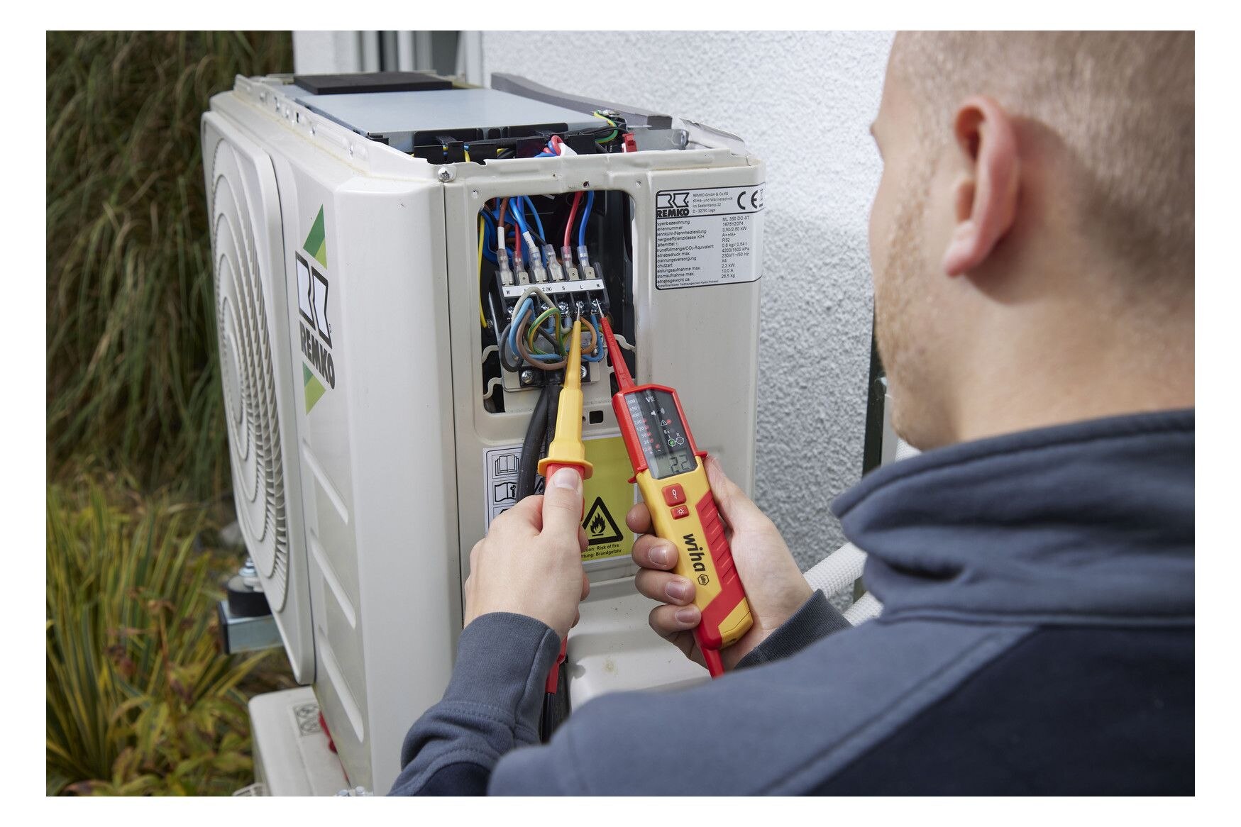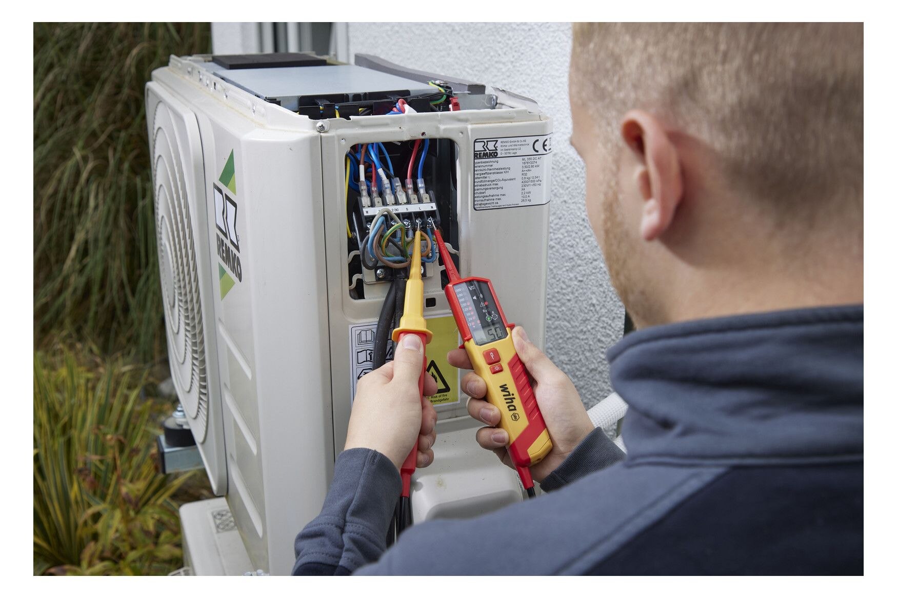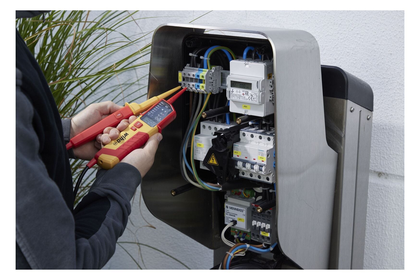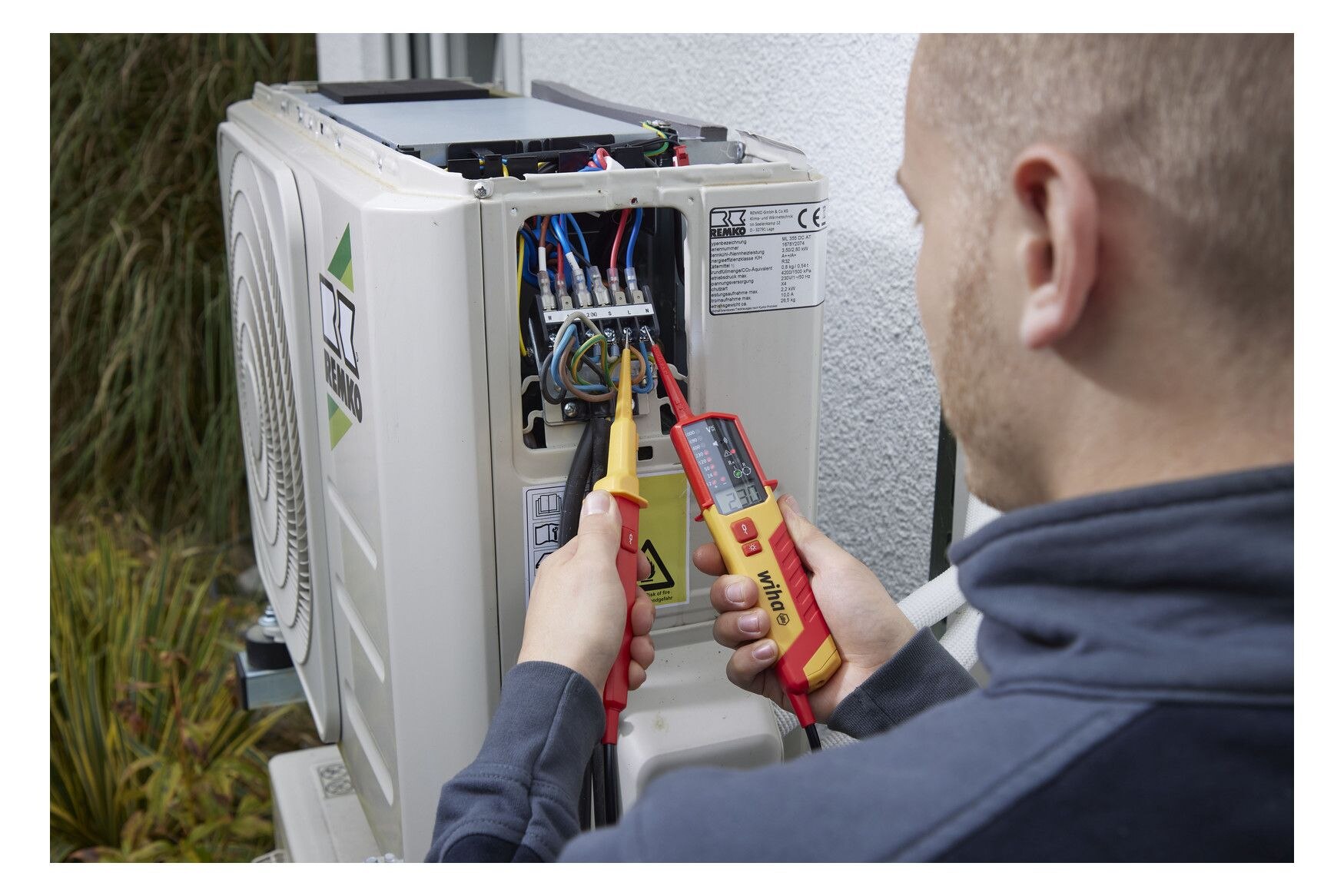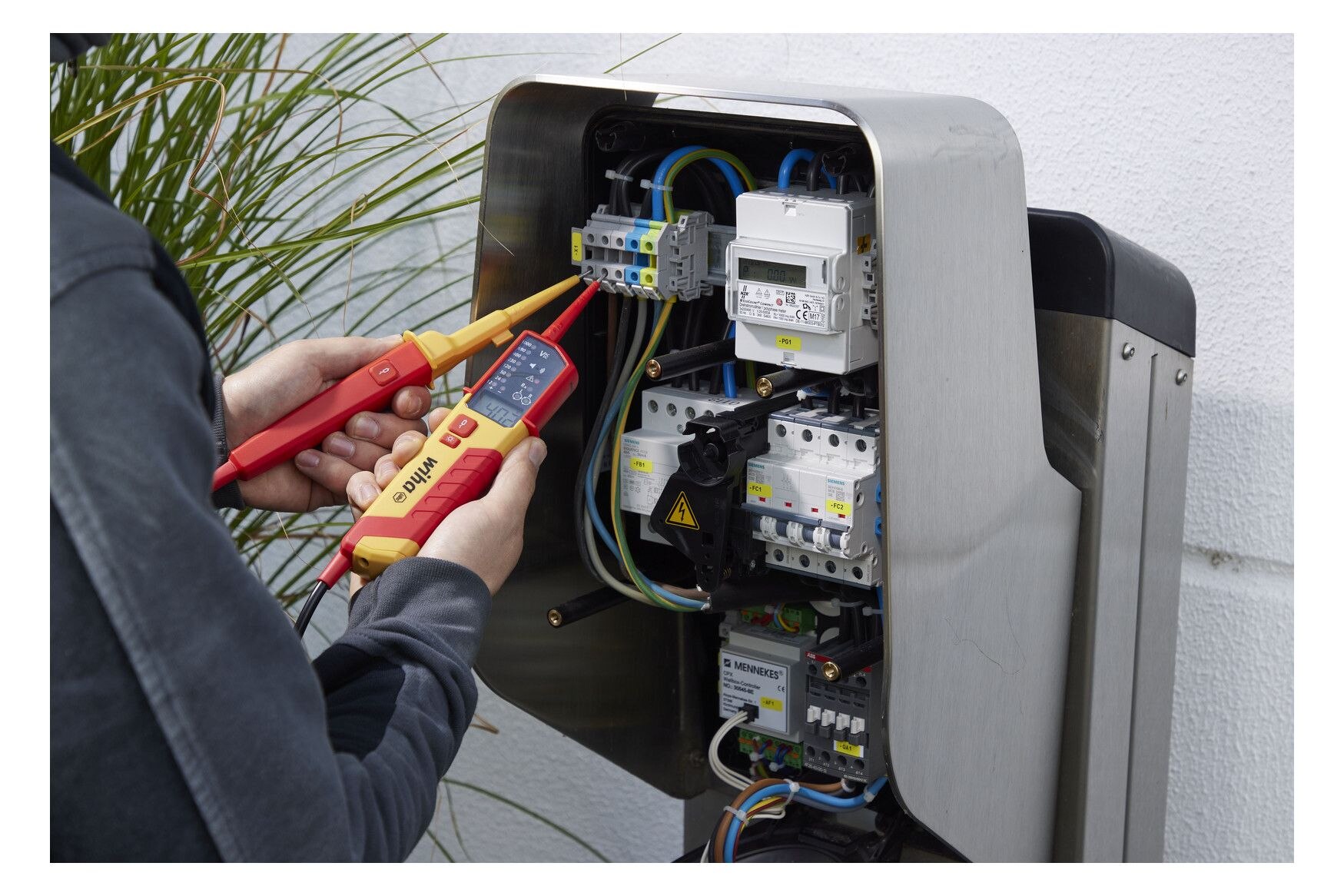 Erhöht Ihre Flexibilität: Deckt den relevanten Spannungsbereich für Arbeiten eines Elektrikers ab. Vereinfacht Ihre Arbeit: Grose LCD-Anzeige mit Hintergrundbeleuchtung, LED-Skala und Signalton für einfach ablesbare Messergebnisse. Vereinfacht Ihre Arbeit: Eine integrierte Taschenlampenfunktion sorgt für optimale Lichtverhältnisse. Erfüllt Ihre Ansprüche: Überprüfung der FI-Auslösung durch zwei Lasttasten. Mase: 240 x 75 x 30 mm Anwendung: Zum Feststellen von Spannungsfreiheit. Anwendung: Zur normgerechten Spannungsprüfung, Durchgangsprüfung, Drehfeldprüfung und Widerstandsmessung inkl. FI-Schutzschalter Auslösung. Messkategorie: CAT III 1.000 V . CAT IV 600 V Normen: Photovoltaik geeignet 0,5 - 1.000 V AC . 1.500 V DC CAT III 1.000 V . CAT IV 600 V Einhandprüfung Drehfeldmessung FI-Lasttasten Sicherheitsregel: Spannungsfreiheit feststellen! Der Spannungs- und Durchgangsprüfer von Wiha ist ihr idealer täglicher Begleiter um diese Voraussetzung der Sicherheitsregel einfach zu prüfen und Sie bei vielfältigen Anforderungen in Ihrem Berufsalltag zu unterstützen. Er ermöglicht eine Spannungsprüfung für einen umfangreichen Messbereich von 0,5V bis 1.000 V AC bzw. 1.500 V DC. Zusätzlich bietet der Spannungsprüfer die Möglichkeit der Durchgangsprüfung, der optischen Drehfeldprüfung, der Einpolprüfung sowie der automatischen Polaritätserkennung. Darüber hinaus können Widerstandsmessungen und Frequenzmessungen durchgeführt werden. Die Messergebnisse sind dank einer grosen digitalen LCD-Anzeige, mit Hintergrundbeleuchtung sowie einer LED-Anzeige sofort ablesbar. Ein zusätzlicher Signalton signalisiert den Stromfluss bei der Durchgangsprüfung. Auserdem kann die Prüfung an Steckdosen komfortabel mit Hilfe des integrierten Abstandhalters einhändig durchgeführt werden. Zusätzlich bietet der Spannungsprüfer von Wiha, dank integrierter Taschenlampenfunktion, optimale Lichtverhältnisse, auch in schlecht beleuchteten Arbeitsumgebungen. Gleichzeitiges Drücken der Tasten an beiden Griffen der Prüfspitzen ermöglicht die Funktionsprüfung des FI-Schutzschalters durch das Zuschalten einer Last. Gemäs den Messkategorien CAT III bis 1.000 V und CAT IV bis 600 V bietet der Spannungs- und Durchgangsprüfer von Wiha maximale Sicherheit für Arbeiten im Bereich der Gebäudeinstallation sowie direkt an Quellen der Niederspannungsinstallation. IEC.EN 61243-3:2014, IP64, CE
