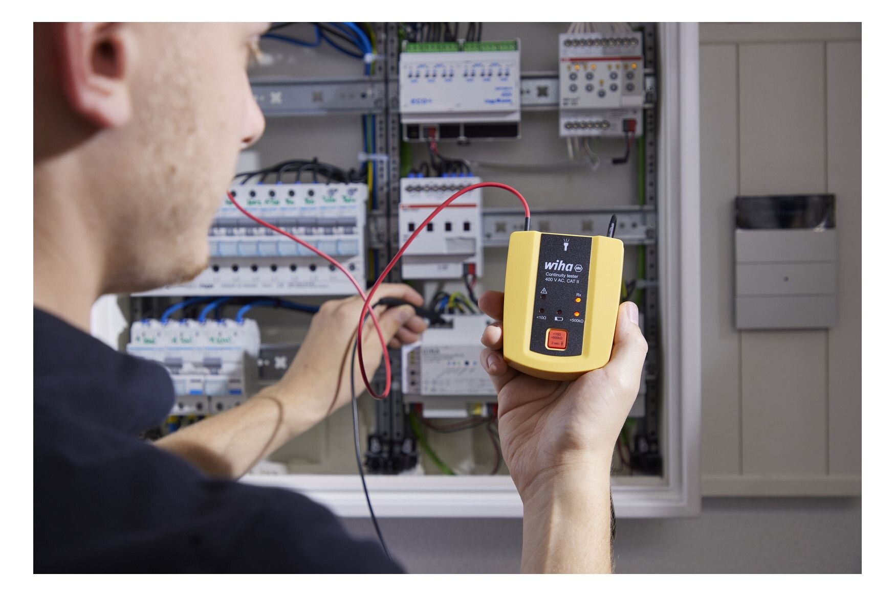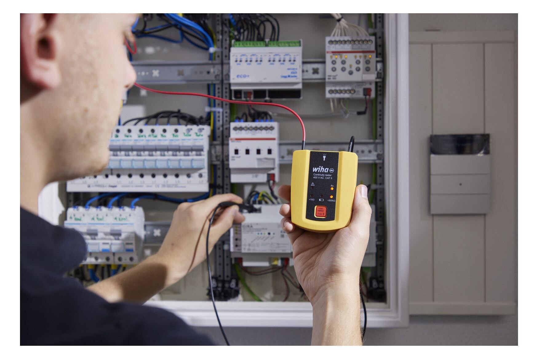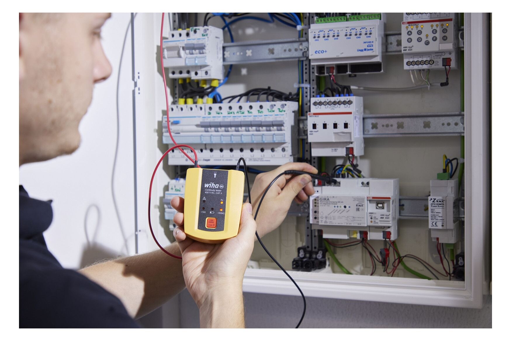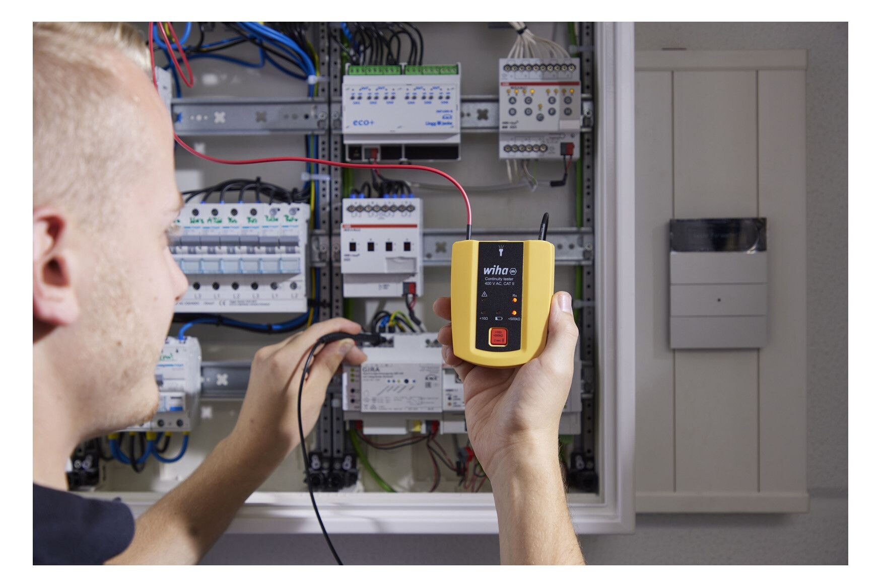 Vereinfacht Ihre Arbeit: Einfache Prüfung dank LED-Anzeige und Signalton. Vereinfacht Ihre Arbeit: Eine integrierte Taschenlampenfunktion sorgt für optimale Lichtverhältnisse. Erhöht Ihre Flexibilität: Schnelle Durchgangsprüfung bis zu 20 mA Prüfstrom und zwei grosen Widerstandsbereichen bis 10 O und bis 500 kO. Mase: 9,0 x 7,5 cm Anwendung: Für die Überprüfung elektischer Verbindungen, Bauteile und Geräte. Messkategorie: CAT II 400 V 400 V . 20 mA . 10 O . < 500 kO Sehr lauter Signalton LED-Anzeige Integrierte Taschenlampenfunktion Wurde die Installation korrekt durchgeführt? Mit dem Durchgangsprüfer von Wiha können Stromkreise und elektrische Verbraucher schnell und unkompliziert auf Durchgang getestet werden. Dank einem Signalton und einer LED-Anzeige ist die Durchgangsmessung einfach ablesbar. Wird das Gerät 30 Sekunden lang nicht verwendet, schaltet es sich automatisch aus um Energie zu sparen. Zusätzlich bietet der Durchgangsprüfer von Wiha dank integrierter Taschenlampenfunktion optimale Lichtverhältnisse, auch in schlecht beleuchteten Arbeitsumgebungen. Sowohl im Bereich von Prüfstrom als auch in Widerstandsbereichen erzeugt der Durchgangsprüfer von Wiha zuverlässige Prüfergebnisse und bietet gemäs der CAT II bis 400 V maximale Sicherheit. IEC.EN 61010-1, IP40, CE