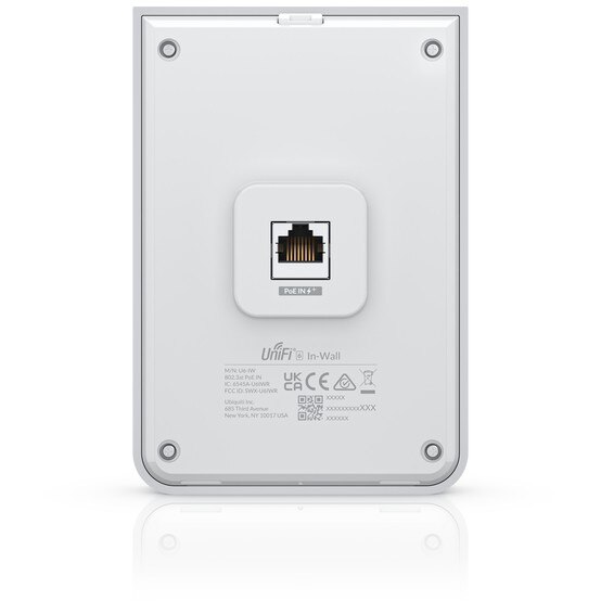 Ubiquiti Unifi 6 In-Wall. 2,4 GHz, 5 GHz, Maximale Datenübertragungsrate: 4800 Mbit/s. Unterstützte Sicherheitsalgorithmen: WPA, WPA-Enterprise, WPA-PSK, WPA2, WPA3. Power over Ethernet (PoE). Produktfarbe: Weiß. Stromverbrauch (max.): 15,4 W