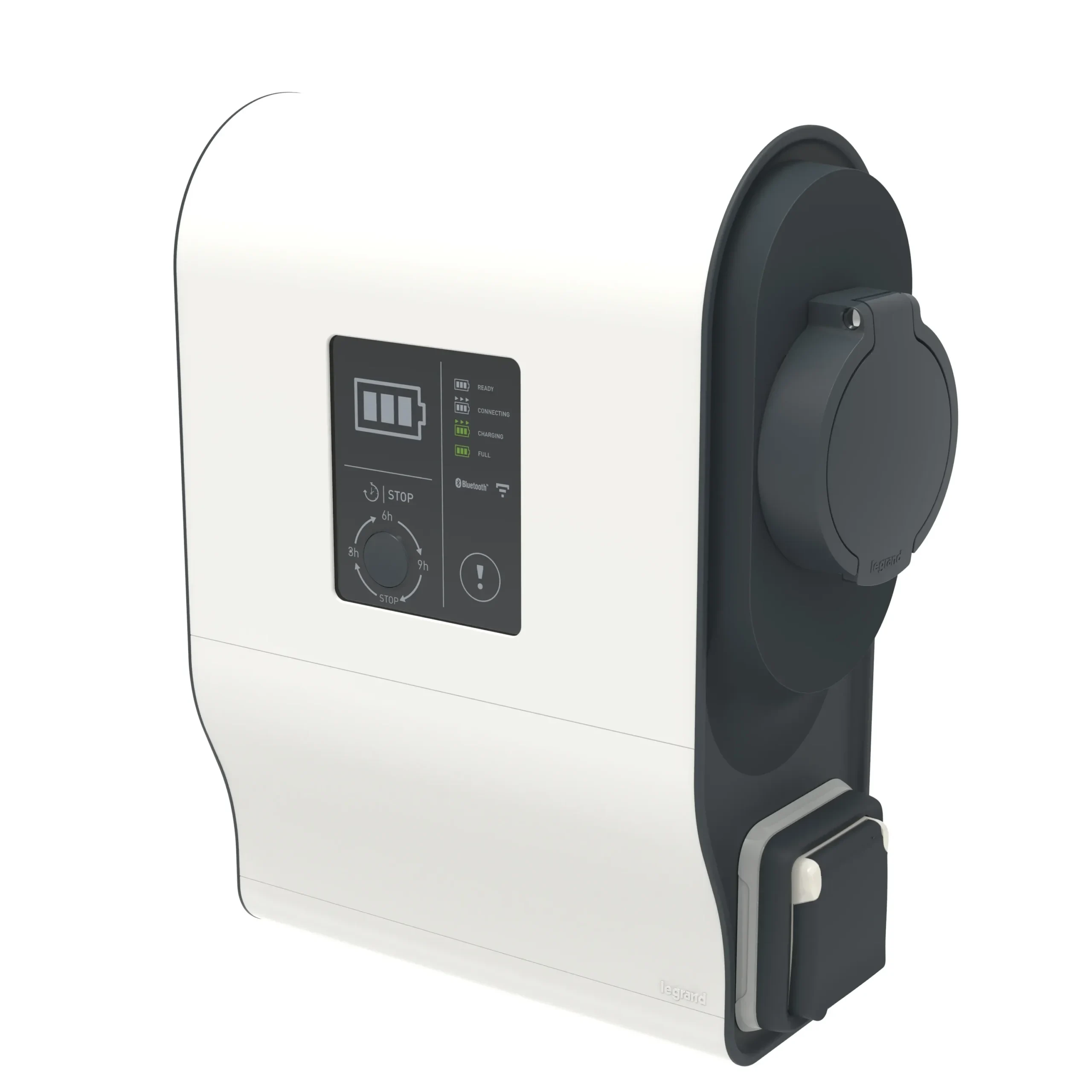 Legrand Green´up Wandladestation 3,7/4,6 kW, Ladesteckdose Typ 2 mit Berührungsschutz Mode 3 und Green´up Schutzkontaktsteckdose Mode 2, zur Ladung von elektrischen Fahrzeugen nach IEC 61851-1. Die verstäkte Green´up Schutzkontaktsteckdose ermöglicht eine verkürzte Ladedauer mittels maximalen Ladestrom von bis zu 16 A. 1-phasiges Laden 230 V AC, Ladeleistung einstellbar: 3,7 oder 4,6 kW / Ladestrom 16 oder 20 A. Anzahl der Ladepunkte: 1, Schutzart IP 44 - IK 08, Material: Kunststoff, Farbe: Weiß/Schwarz, Abmessung (HxBxT): 365 x 295 x 140 mm, zur Montage direkt an der Wand oder als Standsäule mit Standfuß Best.Nr. 059052 (Optional). Bedienung der Ladestation mittels einer Funktionstaste für direktes EIN/AUS-Schalten und Laden oder verzögertes einschalten des Ladevorgang um 3, 6 oder 9 Stunden. Beleuchtete Zustandsanzeige für das einfache Erkennen des Betriebsstatus. Programierbares tägliches Laden- /Energiemanagement und Zugangssperre über Integriertes Bluetooth und der EV-Charge App. Kontrollfunktion und Fernkonfiguration mit Smartphone oder PC über IP (RJ45) oder WiFi mit Kommunikationsset Best.Nr. 059056 erweiterbar, Protokolle: OCPP 1.6 und 2.0, Modbus RS485. Integrierte DC-Fehlerstromerkennung. Jede Ladestation ist Vorschriftskonform mit einem Fehlerstromschutzschalter und Leitungsschutzschalter gemäß lokaler Anschlussbedingungen vorzusichern.