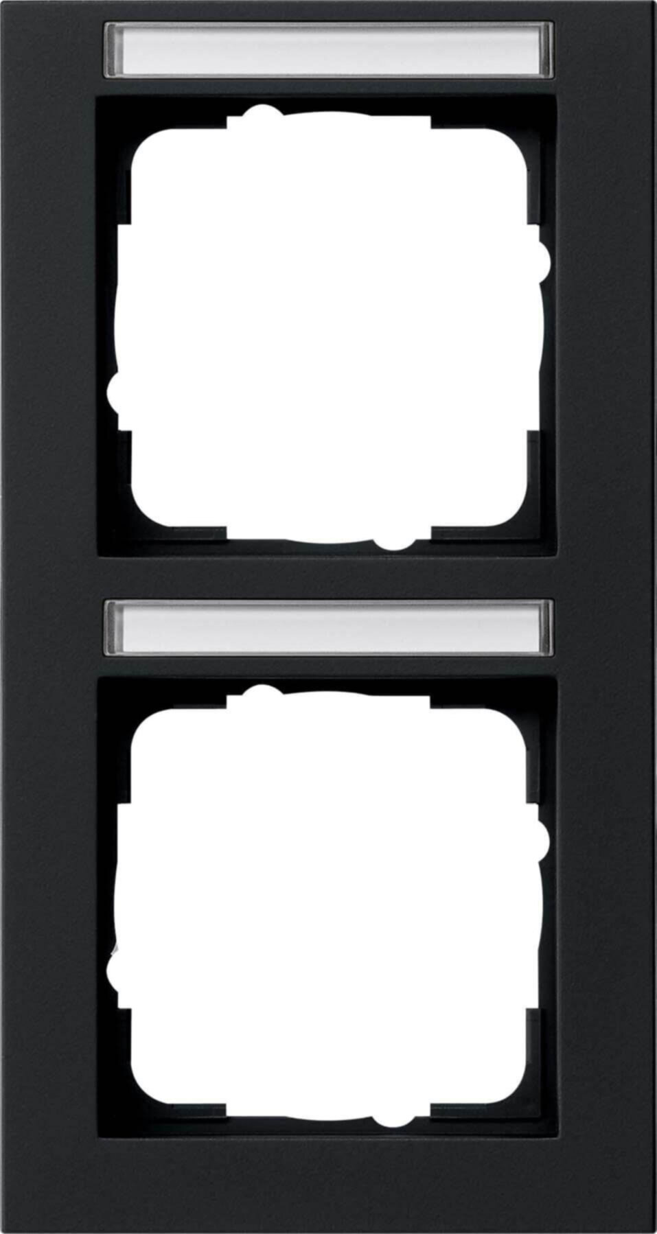 Abdeckrahmen Gira E2 mit Beschriftungsfeld Schwarz matt 2fach senkrecht Merkmale: Bruchsicher. Sprühnebeldicht. Abdeckrahmen mit transparentem Sichtfenster zur Beschriftung der Einsätze. Besonders geeignet für Objekte, in denen Elektroinstallation gekennzeichnet und dokumentiert werden muss, bspw. in Verwaltungen, gewerblichen Betrieben, Flughäfen, Unternehmen und Krankenhäusern. Hinweise : Nicht zu verwenden mit: Dichtungsset IP44, Aufputz-Gehäuse flache Bauweise, Aufputz-Gehäuse.