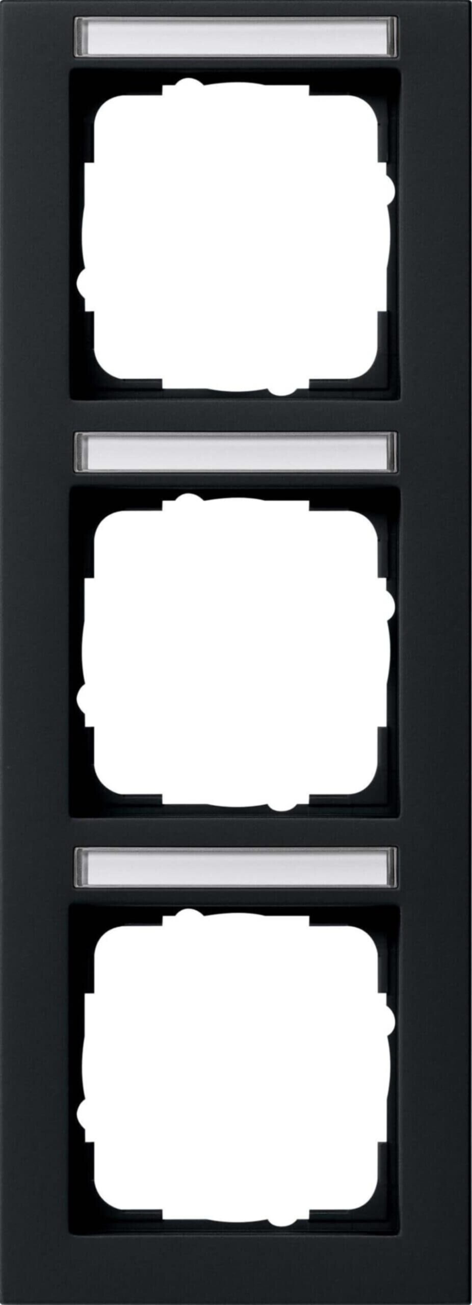 Abdeckrahmen Gira E2 mit Beschriftungsfeld Schwarz matt 3fach senkrecht Merkmale: Bruchsicher. Sprühnebeldicht. Abdeckrahmen mit transparentem Sichtfenster zur Beschriftung der Einsätze. Besonders geeignet für Objekte, in denen Elektroinstallation gekennzeichnet und dokumentiert werden muss, bspw. in Verwaltungen, gewerblichen Betrieben, Flughäfen, Unternehmen und Krankenhäusern. Hinweise : Nicht zu verwenden mit: Dichtungsset IP44, Aufputz-Gehäuse flache Bauweise, Aufputz-Gehäuse.