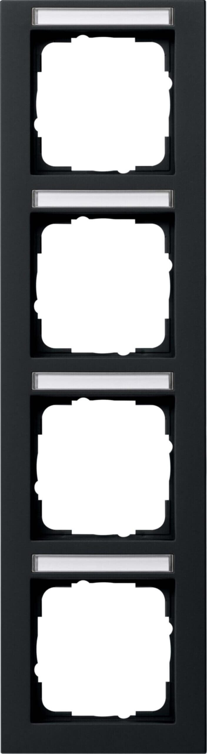 Abdeckrahmen Gira E2 mit Beschriftungsfeld Schwarz matt 4fach senkrecht Merkmale: Bruchsicher. Sprühnebeldicht. Abdeckrahmen mit transparentem Sichtfenster zur Beschriftung der Einsätze. Besonders geeignet für Objekte, in denen Elektroinstallation gekennzeichnet und dokumentiert werden muss, bspw. in Verwaltungen, gewerblichen Betrieben, Flughäfen, Unternehmen und Krankenhäusern. Hinweise : Nicht zu verwenden mit: Dichtungsset IP44, Aufputz-Gehäuse flache Bauweise, Aufputz-Gehäuse.