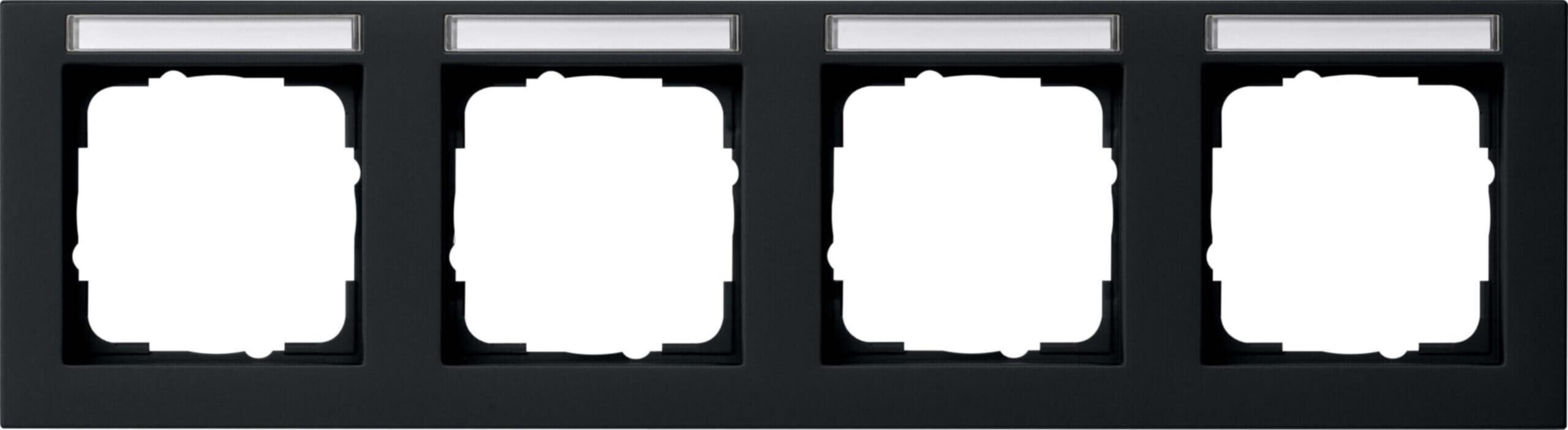 Abdeckrahmen Gira E2 mit Beschriftungsfeld Schwarz matt 4fach waagerecht Merkmale: Bruchsicher. Sprühnebeldicht. Abdeckrahmen mit transparentem Sichtfenster zur Beschriftung der Einsätze. Besonders geeignet für Objekte, in denen Elektroinstallation gekennzeichnet und dokumentiert werden muss, bspw. in Verwaltungen, gewerblichen Betrieben, Flughäfen, Unternehmen und Krankenhäusern. Hinweise : Nicht zu verwenden mit: Dichtungsset IP44, Aufputz-Gehäuse flache Bauweise, Aufputz-Gehäuse.