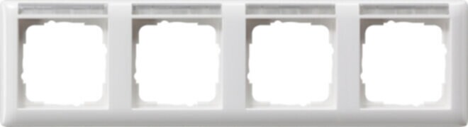 Abdeckrahmen Gira Standard 55 mit Beschriftungsfeld Reinweiß glänzend 4fach waagerecht Merkmale: Bruchsicher. Sprühnebeldicht. Abdeckrahmen mit transparentem Sichtfenster zur Beschriftung der Einsätze. Besonders geeignet für Objekte, in denen Elektroinstallation gekennzeichnet und dokumentiert werden muss, bspw. in Verwaltungen, gewerblichen Betrieben, Flughäfen, Unternehmen und Krankenhäusern. Hinweise : Nicht zu verwenden mit: Dichtungsset IP44, Aufputz-Gehäuse flache Bauweise, Aufputz-Gehäuse.