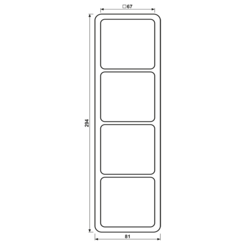 Rahmen 4fach, lichtgrau für waagerechte und senkrechte Kombination Mit Dichtungsflansch Art.-Nr.: 551 WU ist der Schutzgrad IP44 gewährleistet. Material: Duroplast Maße (B x H): 81 x 294 mm