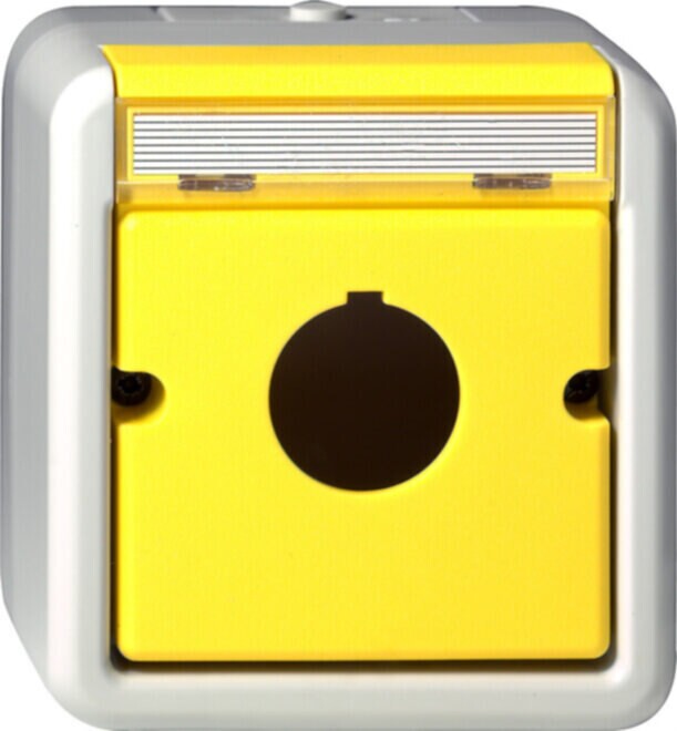 Gehäuse mit gelbem Zentraleinsatz und Beschriftungsfeld zur Aufnahme von Druck- und Pilztastern ( 22,5 mm) Gelb Merkmale: Für Not-Aus oder Not-Halt.