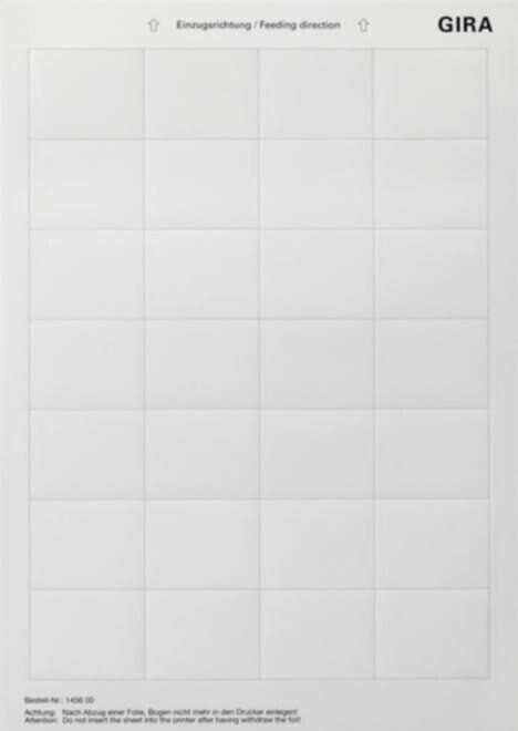 Beschriftungsbögen 46,9 x 36,9 mm - Vorgestanzte Beschriftungsbögen aus einer PET-Folie im DIN A4-Format. Beschriftungsbögen können nur mit einem Laserdrucker bedruckt werden. Um Ihren Druck zu gestalten, geben Sie auf der folgenden Website die Gira Artikelnummer Ihrer Textetiketten ein. https://www.avery-zweckform.com/software/avery-design-print