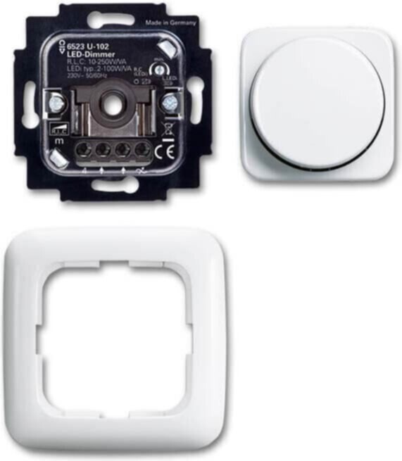 Bestehend aus Busch-LED-Drehdimmer 6523 U-102. Bestehend aus Zentralscheibe mit Drehknopf 2115-214. Bestehend aus Reflex SI-Abdeckrahmen, 1-fach 2511-214. : Reflex SI : Reflex SI