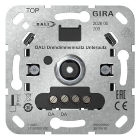 DALI Drehdimmeinsatz Unterputz - Helligkeitseinstellung für Leuchten mit DALI Schnittstelle. - Einstellung der Farbtemperatur für Leuchten mit DALI Device Type 8 für Tunable White gemäß IEC 62386-209. - Drehbedienstelle (Input device) für übergeordnete DALI-2 Steuerungen. Produkteigenschaften ohne Programmierung: - DALI-2 Application Controller ohne Busspannungsversorgung benötigt eine externe DALI Spannungsversorgung nach IEC 62386-101. - Multimasterfähig. - LED zur Gerätelokalisierung. - Speichern der Grundhelligkeit und einer Einschalthelligkeit. - Speichern von Farbtemperatur-Grenzwerten. Produkteigenschaften durch Programmierung über DALI-2 Steuerbefehle: - Geeignet als Drehbedienstelle (Input device) zur Anbindung an zentrale DALI-2 Steuerungen. - Unterstützt vier DALI-2 Instanzen zur Anpassung an zentrale Steuerung. - Kann zur Steuerung einer DALI-2 Gruppe genutzt werden. - Zyklisches Senden der Steuerbefehle an DALI Betriebsgeräte aktivierbar. Die Gerätefunktion ist konfigurationsabhängig