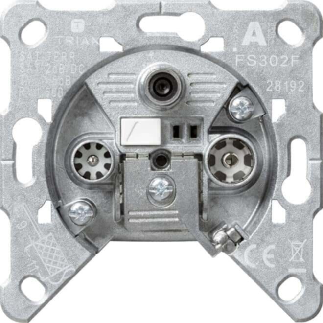 Einsatz Antennensteckdose (FS 302 F) Merkmale: Mit drei Anschlüssen als Enddose verwendbar. Einsatz in Einzelantennenanlagen, hinter einem Multischalter oder an einer entkoppelten Stichleitung. Der Anschluss für den Satelliten-Receiver ist als F-Buchse ausgeführt. Über diesen ist auch die Gleichspannungsübertragung (max. DC 24 V 500 mA) zu einer Satellitenantenne möglich. Hinweise : Nur für Schraubbefestigungestigung. Achtung! Bauraum für Stecker und Biegeradien beachten. Bei Einsätzen mit Kupplungen beachten: Nicht für Kanalinstallation und Standardgerätedose geeignet. Anschluss mit Winkelsteckern empfohlen. Bei Verwendung dieser Steckvorrichtungen besteht für angeschlossene Geräte eine Leistungsbegrenzung von 15 Watt. Installationsempfehlung: Kaiser Elektronic-Dosen Unterputz-Montage: Kaiser Best.-Nr.: 1068-02 Hohlwandmontage: Kaiser Best.-Nr.: 9062-94 Betoninstallation: Kaiser Best.-Nr.: 1268-40