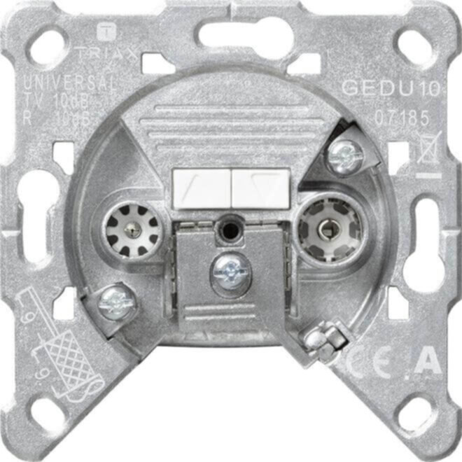 Einsatz Antennensteckdose (GEDU 10) Merkmale: Als Durchgangs- und Enddose verwendbar. Zum Einsatz in Gemeinschaftsantennenanlagen am Ende einer Stammleitung mit mehreren Gerätedosen. An beiden Anschlüssen steht das komplette Signalspektrum von 4 bis 2400 MHz zur Verfügung. Mit Abschlusswiderstand R 77 als Enddose verwendbar. Hinweise : Nur für Schraubbefestigungestigung. Achtung! Bauraum für Stecker und Biegeradien beachten. Bei Einsätzen mit Kupplungen beachten: Nicht für Kanalinstallation und Standardgerätedose geeignet. Anschluss mit Winkelsteckern empfohlen. Bei Verwendung dieser Steckvorrichtungen besteht für angeschlossene Geräte eine Leistungsbegrenzung von 15 Watt. Installationsempfehlung: Kaiser Elektronic-Dosen Unterputz-Montage: Kaiser Best.-Nr.: 1068-02 Hohlwandmontage: Kaiser Best.-Nr.: 9062-94 Betoninstallation: Kaiser Best.-Nr.: 1268-40 Zum reflexionsfreien Abschluss einer Stammleitung, einzusetzen in die letzte Antennensteckdose. Geeignet für terrestrischen Empfang, BK- und Satellitenempfangsanlagen.