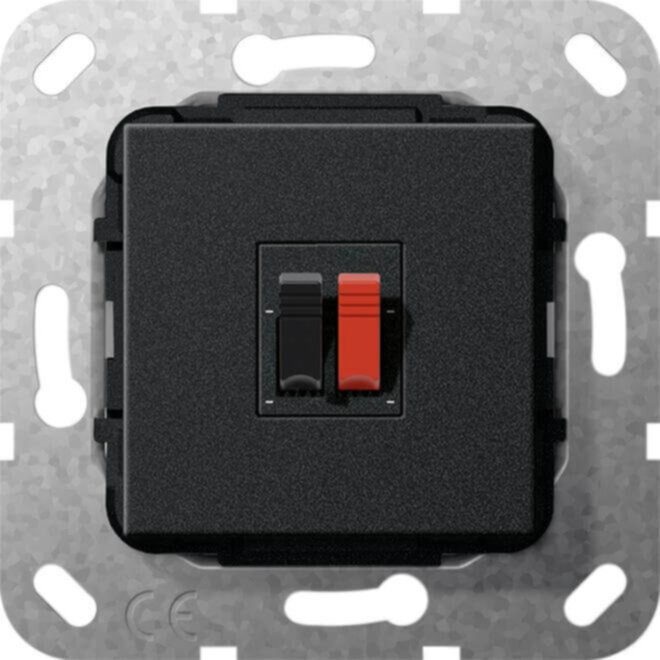 Einsatz Lautsprecheranschluss 1fach Schwarz matt Merkmale: Frontseitiger Anschluss: Steckklemmen, rot schwarz. Rückseitiger Anschluss: Schraubklemmen. Hinweise : Nur für Schraubbefestigungestigung. Achtung! Bauraum für Stecker und Biegeradien beachten. Bei Einsätzen mit Kupplungen beachten: Nicht für Kanalinstallation und Standardgerätedose geeignet. Anschluss mit Winkelsteckern empfohlen. Bei Verwendung dieser Steckvorrichtungen besteht für angeschlossene Geräte eine Leistungsbegrenzung von 15 Watt. Installationsempfehlung: Kaiser Elektronic-Dosen Unterputz-Montage: Kaiser Best.-Nr.: 1068-02 Hohlwandmontage: Kaiser Best.-Nr.: 9062-94 Betoninstallation: Kaiser Best.-Nr.: 1268-40