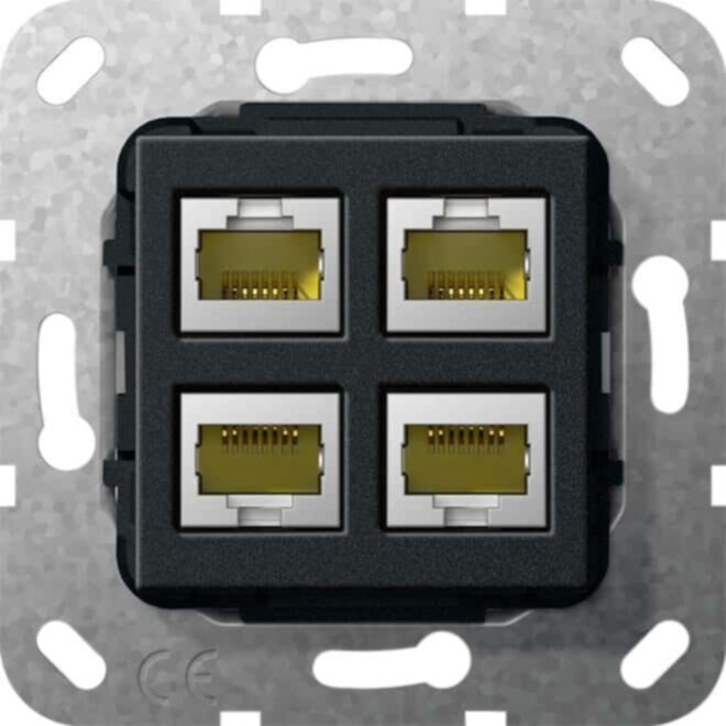 Einsatz Modular Jack RJ45 Cat.6A 10 Gbit-Ethernet 4fach Schneidklemmtechnik Schwarz matt Hinweise : Nur für Schraubbefestigungestigung. Achtung! Bauraum für Stecker und Biegeradien beachten. Bei Verwendung dieser Steckvorrichtungen besteht für angeschlossene Geräte eine Leistungsbegrenzung von 15 Watt. Installationsempfehlung: Kaiser Elektronic-Dosen Unterputz-Montage: Kaiser Best.-Nr.: 1068-02 Hohlwandmontage: Kaiser Best.-Nr.: 9062-94 Betoninstallation: Kaiser Best.-Nr.: 1268-40 Bei Einsätzen mit Kupplungen beachten: Nicht für Kanalinstallation und Standardgerätedose geeignet. Anschluss mit Winkelsteckern empfohlen.