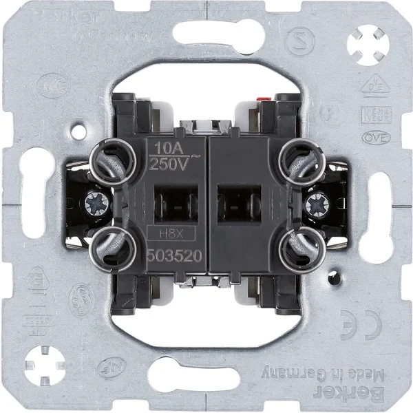 Jalousie-Wippentaster Modul-Einsätze. Jalousie-Wippenschalter, 1-polig, mit mechanischer und elektrischer Verriegelung als Sperre für beidseitiges Eintasten mit Steckklemmen, Schließer. Hinweise der Motorenhersteller beachten.