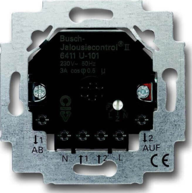 Für Rollladen-, Jalousie- und Markisenantriebe mit mechanischer oder elektronischer Endlagenabschaltung. Mit zwei 230 V-Nebenstelleneingängen (Auf/Ab) für Gruppensteuerung. Mit Betriebsartenschalter für Betriebsarten: Normal, Lamelle, Zentrale, Position. Mit Party-Funktion (Deaktivierung der Vorort-Bedienstelle) in Kombination mit Busch-Jalousiecontrol II Bedienelement 6430-xx-xxx, 6066-xx-xxx. Windalarm-, Putz-Funktion über Nebenstelleneingang realisierbar. Für Bedienelement 6430-xx-xxx. Für IR-Bedienelement 6066-xx-xxx. Für Komfort-Timer-Bedienelement 6455-101. Laufzeit: 3 min. Kompatibel zu den Typen 6411 U. Montage in UP Dosen nach DIN 49073 erforderlich. : Plattform 63, Busch-Duro 2000 SI, Reflex SI, Busch-balance SI, future linear, Busch-axcent , solo , pur edelstahl, carat , Busch-dynasty , impuls, alpha : Busch-Duro 2000 SI, Busch-Duro 2000 SI Linear, Reflex SI, Reflex SI Linear, future , future linear, Busch-axcent , Busch-axcent pur, alpha exclusive , alpha nea