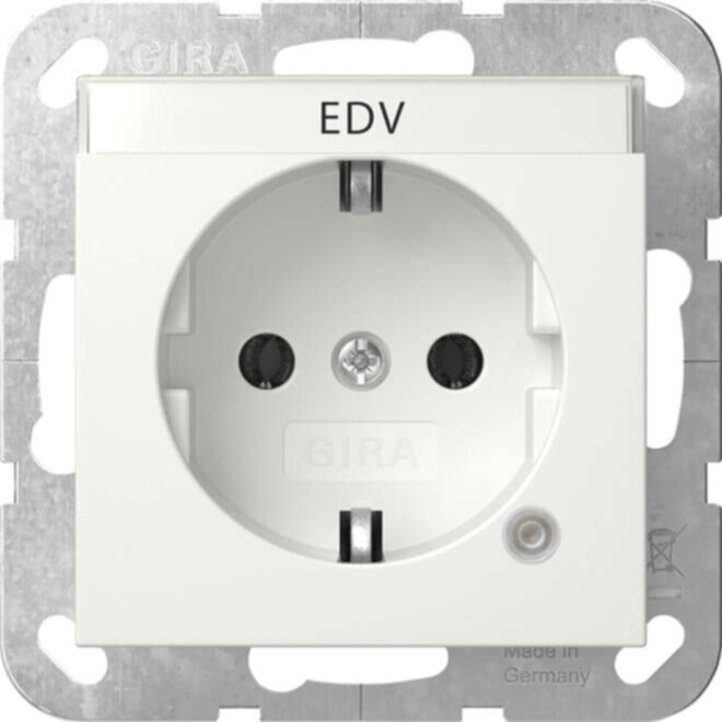 SCHUKO-Steckdose 16 A 250 V~ mit Kontrolllicht und Beschriftungsfeld Reinweiß glänzend System 55 - Geerdeter Tragring. Mit erhöhtem Anpressdruck des Erdungsbügels geprüft nach T.N.O. LED-Beleuchtungselement ist im Lieferumfang enthalten. Beschriftungsschild EDV ist beigefügt.