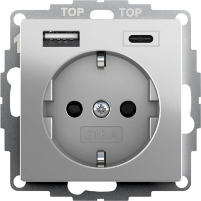 SCHUKO-Steckdose 16 A 250 V~ mit erhöhtem Berührungsschutz (Safety Plus) und USB-Spannungsversorgung 2fach Edelstahl (lackiert) Typ A / Typ C - Lademöglichkeit für bis zu zwei Endgeräte gleichzeitig über USB-Kabel Typ A und Typ C. - Es können bis zu zwei Endgeräte gleichzeitig geladen werden. Erhöhter Berührungsschutz (Safety Plus) gemäß DIN VDE 0620-1. Bei langen Ladezyklen kann sich das Gehäuse des Produkts erwärmen. Verwendung einer tiefen Gerätedose empfohlen. USB-Kabel Typ A oder Typ C sind nicht im Lieferumfang enthalten.