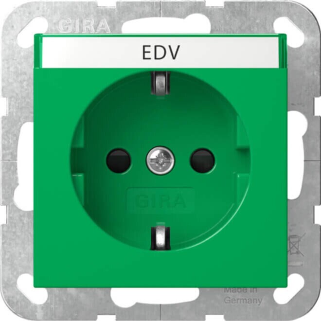 SCHUKO-Steckdose 16 A 250 V~ mit Beschriftungsfeld und erhöhtem Berührungsschutz (Safety Plus) Grün glänzend mit grüner Abdeckung - Geerdeter Tragring. Mit erhöhtem Anpressdruck des Erdungsbügels geprüft nach T.N.O. Erhöhter Berührungsschutz (Safety Plus) gemäß DIN VDE 0620-1. Beschriftungsschild EDV ist beigefügt.