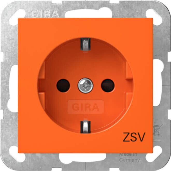 SCHUKO-Steckdose 16 A 250 V~ mit erhöhtem Berührungsschutz (Safety Plus) Orange glänzend mit oranger Abdeckung und Aufdruck ZSV (zusätzliche Sicherheitsversorgung) - Geerdeter Tragring. Mit erhöhtem Anpressdruck des Erdungsbügels geprüft nach T.N.O. Erhöhter Berührungsschutz (Safety Plus) gemäß DIN VDE 0620-1.