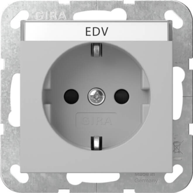 SCHUKO-Steckdose 16 A 250 V~ mit Beschriftungsfeld und erhöhtem Berührungsschutz (Safety Plus) Grau matt (lackiert) System 55 - Geerdeter Tragring. Mit erhöhtem Anpressdruck des Erdungsbügels geprüft nach T.N.O. Erhöhter Berührungsschutz (Safety Plus) gemäß DIN VDE 0620-1. Beschriftungsschild EDV ist beigefügt.