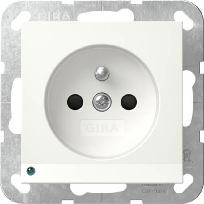 Steckdose mit Erdungsstift 16 A 250 V~, LED-Orientierungsleuchte und erhöhtem Berührungsschutz (Safety Plus) Reinweiß glänzend System 55 - Steckdose mit Erdungsstift und eingelassener Lichtleiste. - Die weiß leuchtenden LEDs werfen einen Lichtkorridor nach unten. So wird eine indirekte Orientierungsbeleuchtung erzeugt, die auch in Schlafräumen keine lästige Blendung verursacht. - Der integrierte Dämmerungssensor schaltet automatisch die LED-Leuchte erst bei Dämmerung ein und bei ausreichendem Licht wieder aus. - Die LED-Leuchte ist komplett in die Abdeckung integriert und ein separates Anklemmen entfällt. - Mit Steckklemmen. - Tragring ist in Verbindung mit den Befestigungskrallen und Krallenschrauben geerdet. - Schnellbefestigung (ca. 3,5 Umdrehungen pro Befestigungskralle). - Eingehauste Spreizkrallen. - Einfachere Krallenbefestigung durch robusten Schraubenkopfantrieb PZ1 / Schlitz / PH. - Vereinfachte Installation durch patentierte Anordnung der großen Schlüssellochprofile mittels Dosenschrauben. - Geringe Einbautiefe. - Große, ergonomisch geformte Lösehebel. - Stabiler Erdungsbügel mit massiven Erdungsfingern. - Stabiler und korrosionsbeständiger Stahltragring. - Bruchsicherer Thermoplastsockel. Nach NF C 61-314:2017 zugelassen. Nach NBN C 61-112-1:2017 zugelassen. Erhöhter Berührungsschutz (Safety Plus) gemäß DIN VDE 0620-1.