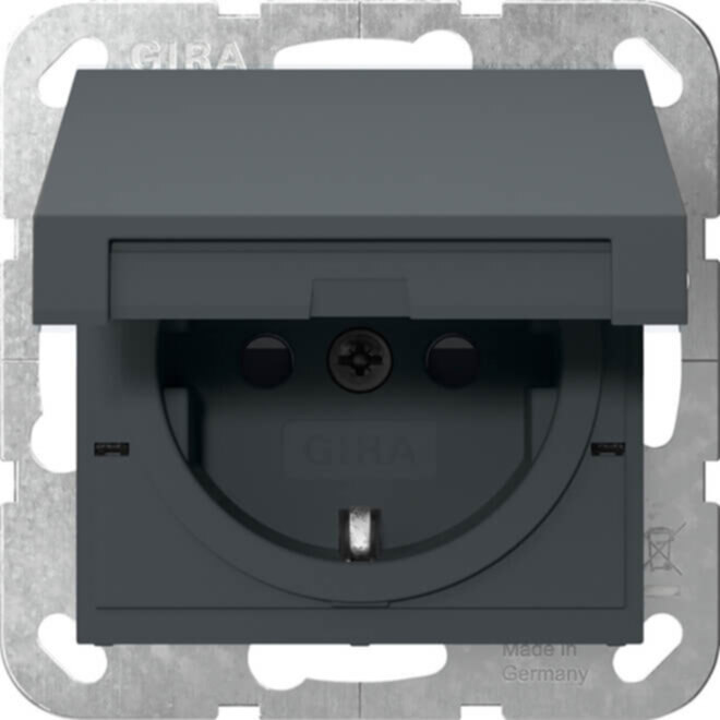 SCHUKO-Steckdose 16 A 250 V~ mit Klappdeckel und erhöhtem Berührungsschutz (Safety Plus) Anthrazit Schraubklemmen - Geerdeter Tragring. Mit erhöhtem Anpressdruck des Erdungsbügels geprüft nach T.N.O. Abdeckrahmen (1- bis 5fach) aus den Schalterprogrammen Standard 55, Gira E1 und Gira E2 in Verbindung mit dem Dichtungsset auch für die Montage von Unterputz-SCHUKO-Steckdosen mit Klappdeckel wassergeschützt IP44 geeignet. Erhöhter Berührungsschutz (Safety Plus) gemäß DIN VDE 0620-1.