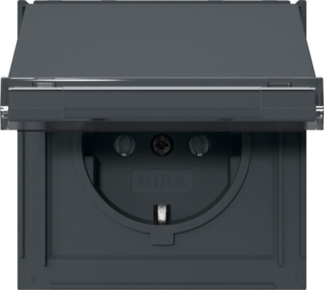 SCHUKO-Steckdose 16 A 250 V~ mit Klappdeckel und Beschriftungsfeld Anthrazit TX_44 - Geerdeter Tragring. Mit erhöhtem Anpressdruck des Erdungsbügels geprüft nach T.N.O. Blanko Beschriftungsschild liegt bei.