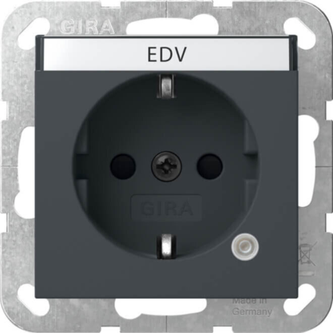SCHUKO-Steckdose 16 A 250 V~ mit Kontrolllicht und Beschriftungsfeld Anthrazit System 55 - Geerdeter Tragring. Mit erhöhtem Anpressdruck des Erdungsbügels geprüft nach T.N.O. LED-Beleuchtungselement ist im Lieferumfang enthalten. Beschriftungsschild EDV ist beigefügt.