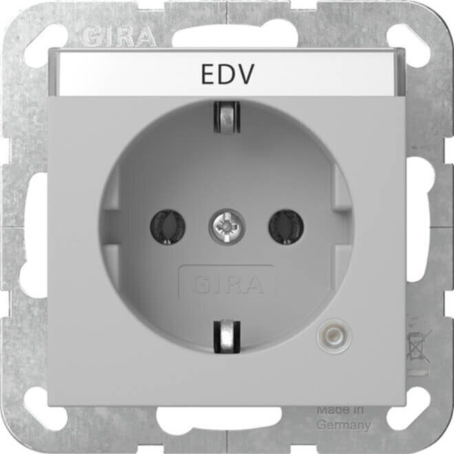 SCHUKO-Steckdose 16 A 250 V~ mit Kontrolllicht und Beschriftungsfeld Grau matt (lackiert) System 55 - Geerdeter Tragring. Mit erhöhtem Anpressdruck des Erdungsbügels geprüft nach T.N.O. LED-Beleuchtungselement ist im Lieferumfang enthalten. Beschriftungsschild EDV ist beigefügt.
