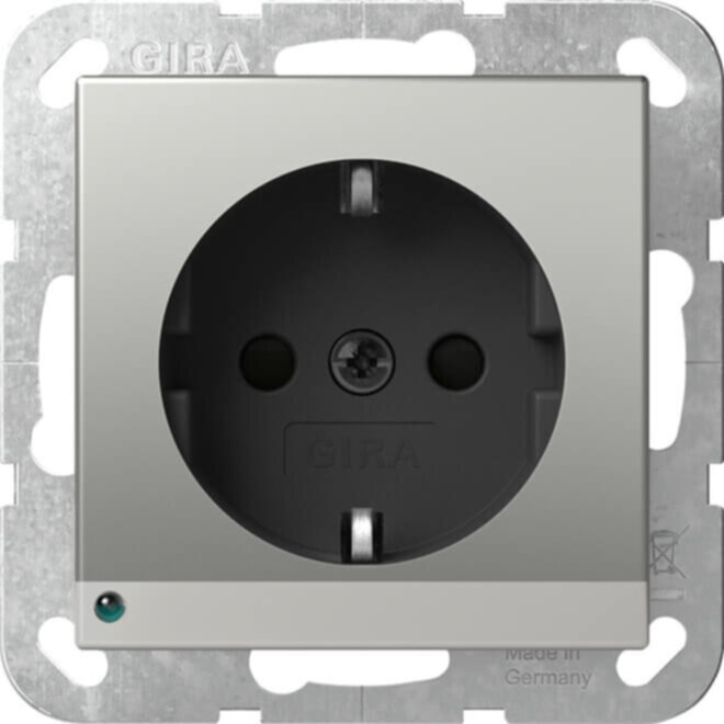 SCHUKO-Steckdose 16 A 250 V~ mit LED-Orientierungsleuchte und erhöhtem Berührungsschutz (Safety Plus) Edelstahl (lackiert) System 55 - SCHUKO-Steckdose mit eingelassener Lichtleiste. - Die weiß leuchtenden LEDs werfen einen Lichtkorridor nach unten. So wird eine indirekte Orientierungsbeleuchtung erzeugt, die auch in Schlafräumen keine lästige Blendung verursacht. - Der integrierte Dämmerungssensor schaltet automatisch die LED-Leuchte erst bei Dämmerung ein und bei ausreichendem Licht wieder aus. - Die LED-Leuchte ist komplett in die Abdeckung integriert und ein separates Anklemmen entfällt. - Geerdeter Tragring. Mit erhöhtem Anpressdruck des Erdungsbügels geprüft nach T.N.O. Erhöhter Berührungsschutz (Safety Plus) gemäß DIN VDE 0620-1.