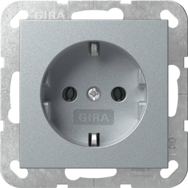 SCHUKO-Steckdose 16 A 250 V~ ohne Befestigungskrallen Farbe Alu System 55 Mit erhöhtem Anpressdruck des Erdungsbügels geprüft nach T.N.O.