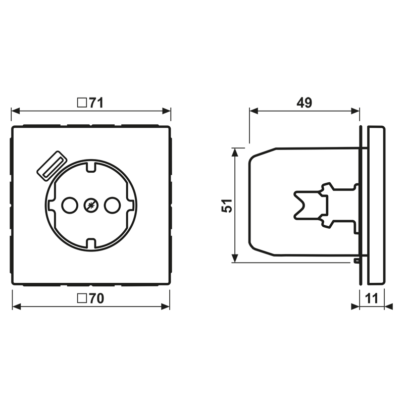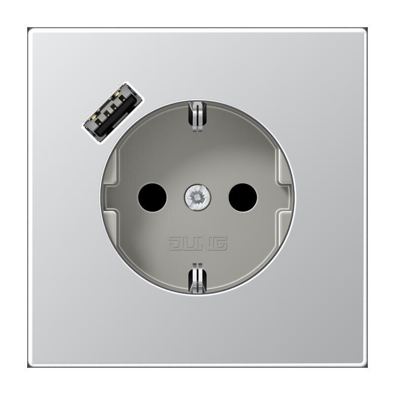 mit integriertem erhöhten Berührungsschutz (Safety Plus) mit 1 USB-Buchse Typ A mit Schnellladefunktion mit Federklemmen für starre und unbehandelte flexible Leiter bis 2,5 mm2 Verbindungsklemmen nach DIN VDE 0620 Montage in Gerätedose mit Abmessungen nach DIN 49073 Tiefe der Gerätedose (Innenmaß): min. 57 mm Material: Aluminium AlMg1 Naturton, mattgebeizt