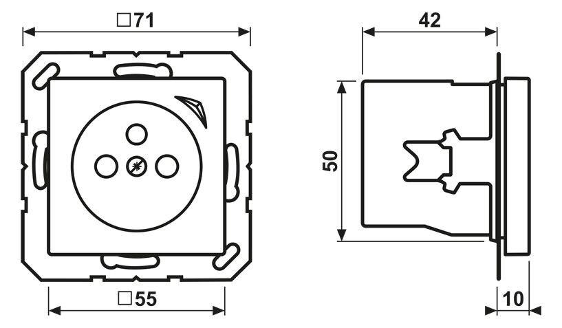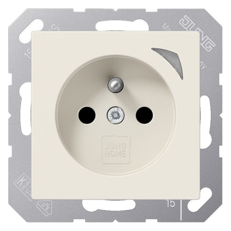 JUNG HOME Steckdose, französisch/belgisches System, weiß2-polig mit Erdungsstift, 16 A 250 V ~CEE 7/5mit integriertem erhöhten Berührungsschutz (Safety Plus)mit Schraubklemmen für starre und flexible Leiter bis 2,5 mm2Verbindungsklemmen nach DIN VDE 0620Tragring, Krallen und Krallenschrauben sind über eine Erdungsschiene in die Schutzmaßnahme eingebunden.Bestimmungsgemäßer GebrauchManuelles oder automatisches Schalten von Beleuchtung und haushaltsüblichen GerätenDrahtlose Verknüpfung mit Geräten des JUNG HOME SystemsEinsatz im trockenen InnenbereichMontage in Gerätedose mit Abmessungen nach DIN 49073Tiefe der Gerätedose (Innenmaß): min. 50 mm ProdukteigenschaftenInbetriebnahme und Bedienung über JUNG HOME App mit mobilem Endgerät (Smartphone oder Tablet) über Bluetooth®Taste zum SchaltenMehrfarbige Statusanzeige mit optionalem NachtmodusSperren der lokalen BedienungBis zu 16 ZeitprogrammeEinbindung der Last in Bereiche (Gruppen), Zentralfunktionen und SzenenAutomatikfunktionen aktivieren/deaktivieren über JUNG HOME AppAutomatische Datum- und Uhrzeitaktualisierung bei Verbindung mit SmartphoneIntegrierter Schaltaktor mit 16 ABluetooth® SIG Mesh für voll verschlüsselte drahtlose Kommunikation und RepeaterfunktionUpdatefähig über JUNG HOME App Zukünftig per Update verfügbar:(Hinweise zu Updates und Terminen finden sie unter www.jung.de/JUNGHOME)Sperr- und Zwangsführung: Dauer-EIN/AUS oder für feste Zeit EIN/AUSZeitprogramme mit Sonnenauf- bzw. Sonnenuntergang (Astrotimer)Zeitprogramme mit ZufallszeitpunktEin-/ AusschaltverzögerungEingespeiste Leistung von -0,1 bis -3680 Watt und eingespeiste Energie (kWh)Material: ThermoplastMaße (B x H): 55 x 55 mm