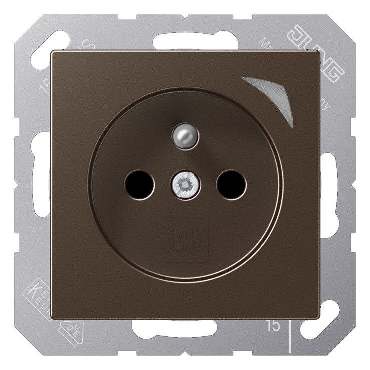 JUNG HOME Steckdose, französisch/belgisches System, mokka2-polig mit Erdungsstift, 16 A 250 V ~CEE 7/5mit integriertem erhöhten Berührungsschutz (Safety Plus)mit Schraubklemmen für starre und flexible Leiter bis 2,5 mm2Verbindungsklemmen nach DIN VDE 0620Tragring, Krallen und Krallenschrauben sind über eine Erdungsschiene in die Schutzmaßnahme eingebunden.Bestimmungsgemäßer GebrauchManuelles oder automatisches Schalten von Beleuchtung und haushaltsüblichen GerätenDrahtlose Verknüpfung mit Geräten des JUNG HOME SystemsEinsatz im trockenen InnenbereichMontage in Gerätedose mit Abmessungen nach DIN 49073Tiefe der Gerätedose (Innenmaß): min. 50 mm ProdukteigenschaftenInbetriebnahme und Bedienung über JUNG HOME App mit mobilem Endgerät (Smartphone oder Tablet) über Bluetooth®Taste zum SchaltenMehrfarbige Statusanzeige mit optionalem NachtmodusSperren der lokalen BedienungBis zu 16 ZeitprogrammeEinbindung der Last in Bereiche (Gruppen), Zentralfunktionen und SzenenAutomatikfunktionen aktivieren/deaktivieren über JUNG HOME AppAutomatische Datum- und Uhrzeitaktualisierung bei Verbindung mit SmartphoneIntegrierter Schaltaktor mit 16 ABluetooth® SIG Mesh für voll verschlüsselte drahtlose Kommunikation und RepeaterfunktionUpdatefähig über JUNG HOME App Zukünftig per Update verfügbar:(Hinweise zu Updates und Terminen finden sie unter www.jung.de/JUNGHOME)Sperr- und Zwangsführung: Dauer-EIN/AUS oder für feste Zeit EIN/AUSZeitprogramme mit Sonnenauf- bzw. Sonnenuntergang (Astrotimer)Zeitprogramme mit ZufallszeitpunktEin-/ AusschaltverzögerungEingespeiste Leistung von -0,1 bis -3680 Watt und eingespeiste Energie (kWh)Material: Thermoplast lackiertMaße (B x H): 55 x 55 mm