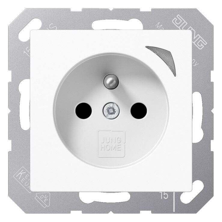 JUNG HOME Steckdose, französisch/belgisches System, alpinweiß2-polig mit Erdungsstift, 16 A 250 V ~CEE 7/5mit integriertem erhöhten Berührungsschutz (Safety Plus)mit Schraubklemmen für starre und flexible Leiter bis 2,5 mm2Verbindungsklemmen nach DIN VDE 0620Tragring, Krallen und Krallenschrauben sind über eine Erdungsschiene in die Schutzmaßnahme eingebunden.Bestimmungsgemäßer GebrauchManuelles oder automatisches Schalten von Beleuchtung und haushaltsüblichen GerätenDrahtlose Verknüpfung mit Geräten des JUNG HOME SystemsEinsatz im trockenen InnenbereichMontage in Gerätedose mit Abmessungen nach DIN 49073Tiefe der Gerätedose (Innenmaß): min. 50 mm ProdukteigenschaftenInbetriebnahme und Bedienung über JUNG HOME App mit mobilem Endgerät (Smartphone oder Tablet) über Bluetooth®Taste zum SchaltenMehrfarbige Statusanzeige mit optionalem NachtmodusSperren der lokalen BedienungBis zu 16 ZeitprogrammeEinbindung der Last in Bereiche (Gruppen), Zentralfunktionen und SzenenAutomatikfunktionen aktivieren/deaktivieren über JUNG HOME AppAutomatische Datum- und Uhrzeitaktualisierung bei Verbindung mit SmartphoneIntegrierter Schaltaktor mit 16 ABluetooth® SIG Mesh für voll verschlüsselte drahtlose Kommunikation und RepeaterfunktionUpdatefähig über JUNG HOME App Zukünftig per Update verfügbar:(Hinweise zu Updates und Terminen finden sie unter www.jung.de/JUNGHOME)Sperr- und Zwangsführung: Dauer-EIN/AUS oder für feste Zeit EIN/AUSZeitprogramme mit Sonnenauf- bzw. Sonnenuntergang (Astrotimer)Zeitprogramme mit ZufallszeitpunktEin-/ AusschaltverzögerungEingespeiste Leistung von -0,1 bis -3680 Watt und eingespeiste Energie (kWh)Material: ThermoplastMaße (B x H): 55 x 55 mm