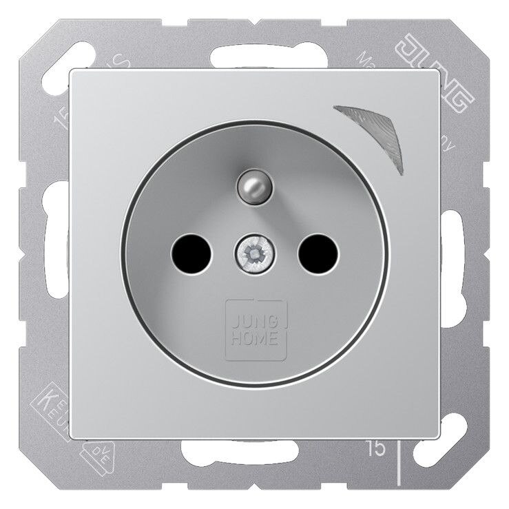 JUNG HOME Steckdose Energy, französisch/belgisches System, aluminium2-polig mit Erdungsstift, 16 A 250 V ~CEE 7/5mit integriertem erhöhten Berührungsschutz (Safety Plus)mit Schraubklemmen für starre und flexible Leiter bis 2,5 mm2Verbindungsklemmen nach DIN VDE 0620Tragring, Krallen und Krallenschrauben sind über eine Erdungsschiene in die Schutzmaßnahme eingebunden.Bestimmungsgemäßer GebrauchManuelles oder automatisches Schalten von Beleuchtung und haushaltsüblichen GerätenLeistungs- (W) und Energiemessung (kWh) der angeschlossenen GeräteDrahtlose Verknüpfung mit Geräten des JUNG HOME SystemsEinsatz im trockenen InnenbereichMontage in Gerätedose mit Abmessungen nach DIN 49073Tiefe der Gerätedose (Innenmaß): min. 50 mm ProdukteigenschaftenInbetriebnahme und Bedienung über JUNG HOME App mit mobilem Endgerät (Smartphone oder Tablet) über Bluetooth®Taste zum SchaltenMehrfarbige Statusanzeige mit optionalem NachtmodusSperren der lokalen BedienungBis zu 16 ZeitprogrammeEinbindung der Last in Bereiche (Gruppen), Zentralfunktionen und SzenenAutomatikfunktionen aktivieren/deaktivieren über JUNG HOME AppAutomatische Datum- und Uhrzeitaktualisierung bei Verbindung mit SmartphoneIntegrierter Schaltaktor mit 16 ALeistungsmessung von 0,1 bis 3680 Watt und Energiemessung (kWh)Aufzeichnung des Energieverlaufes letzte 24 Stunden und letzte 31 Tage (Charting)Betriebsstundenzähler, Zeitraum der EnergiemessungPower-Save-Funktion (Abschalten von Standby-Verbrauchern)Master-Slave-Funktion (abhängig vom angeschlossenen Verbraucher einen drahtlos verknüpften Verbraucher einschalten)Überstrom-SchutzabschaltungBluetooth® SIG Mesh für voll verschlüsselte drahtlose Kommunikation und RepeaterfunktionUpdatefähig über JUNG HOME App Zukünftig per Update verfügbar:(Hinweise zu Updates und Terminen finden sie unter www.jung.de/JUNGHOME)Sperr- und Zwangsführung: Dauer-EIN/AUS oder für feste Zeit EIN/AUSZeitprogramme mit Sonnenauf- bzw. Sonnenuntergang (Astrotimer)Zeitprogramme mit ZufallszeitpunktEin-/ AusschaltverzögerungEingespeiste Leistung von -0,1 bis -3680 Watt und eingespeiste Energie (kWh)Material: Thermoplast lackiertMaße (B x H): 55 x 55 mm