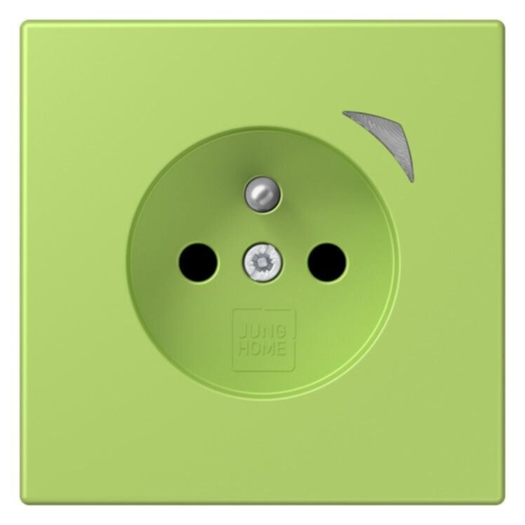 JUNG HOME Steckdose, französisch/belgisches System, vert clair2-polig mit Erdungsstift, 16 A 250 V ~CEE 7/5mit integriertem erhöhten Berührungsschutz (Safety Plus)mit Schraubklemmen für starre und flexible Leiter bis 2,5 mm2Verbindungsklemmen nach DIN VDE 0620Tragring, Krallen und Krallenschrauben sind über eine Erdungsschiene in die Schutzmaßnahme eingebunden.Bestimmungsgemäßer GebrauchManuelles oder automatisches Schalten von Beleuchtung und haushaltsüblichen GerätenDrahtlose Verknüpfung mit Geräten des JUNG HOME SystemsEinsatz im trockenen InnenbereichMontage in Gerätedose mit Abmessungen nach DIN 49073Tiefe der Gerätedose (Innenmaß): min. 50 mm ProdukteigenschaftenInbetriebnahme und Bedienung über JUNG HOME App mit mobilem Endgerät (Smartphone oder Tablet) über Bluetooth®Taste zum SchaltenMehrfarbige Statusanzeige mit optionalem NachtmodusSperren der lokalen BedienungBis zu 16 ZeitprogrammeEinbindung der Last in Bereiche (Gruppen), Zentralfunktionen und SzenenAutomatikfunktionen aktivieren/deaktivieren über JUNG HOME AppAutomatische Datum- und Uhrzeitaktualisierung bei Verbindung mit SmartphoneIntegrierter Schaltaktor mit 16 ABluetooth® SIG Mesh für voll verschlüsselte drahtlose Kommunikation und RepeaterfunktionUpdatefähig über JUNG HOME App Zukünftig per Update verfügbar:(Hinweise zu Updates und Terminen finden sie unter jung.group/junghome)Sperr- und Zwangsführung: Dauer-EIN/AUS oder für feste Zeit EIN/AUSZeitprogramme mit Sonnenauf- bzw. Sonnenuntergang (Astrotimer)Zeitprogramme mit ZufallszeitpunktEin-/ AusschaltverzögerungMaterial: Thermoplast lackiertMaße (B x H): 70 x 70 mm