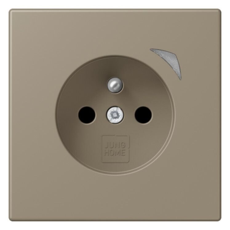 JUNG HOME Steckdose, französisch/belgisches System, ombre naturelle moyenne2-polig mit Erdungsstift, 16 A 250 V ~CEE 7/5mit integriertem erhöhten Berührungsschutz (Safety Plus)mit Schraubklemmen für starre und flexible Leiter bis 2,5 mm2Verbindungsklemmen nach DIN VDE 0620Tragring, Krallen und Krallenschrauben sind über eine Erdungsschiene in die Schutzmaßnahme eingebunden.Bestimmungsgemäßer GebrauchManuelles oder automatisches Schalten von Beleuchtung und haushaltsüblichen GerätenDrahtlose Verknüpfung mit Geräten des JUNG HOME SystemsEinsatz im trockenen InnenbereichMontage in Gerätedose mit Abmessungen nach DIN 49073Tiefe der Gerätedose (Innenmaß): min. 50 mm ProdukteigenschaftenInbetriebnahme und Bedienung über JUNG HOME App mit mobilem Endgerät (Smartphone oder Tablet) über Bluetooth®Taste zum SchaltenMehrfarbige Statusanzeige mit optionalem NachtmodusSperren der lokalen BedienungBis zu 16 ZeitprogrammeEinbindung der Last in Bereiche (Gruppen), Zentralfunktionen und SzenenAutomatikfunktionen aktivieren/deaktivieren über JUNG HOME AppAutomatische Datum- und Uhrzeitaktualisierung bei Verbindung mit SmartphoneIntegrierter Schaltaktor mit 16 ABluetooth® SIG Mesh für voll verschlüsselte drahtlose Kommunikation und RepeaterfunktionUpdatefähig über JUNG HOME App Zukünftig per Update verfügbar:(Hinweise zu Updates und Terminen finden sie unter jung.group/junghome)Sperr- und Zwangsführung: Dauer-EIN/AUS oder für feste Zeit EIN/AUSZeitprogramme mit Sonnenauf- bzw. Sonnenuntergang (Astrotimer)Zeitprogramme mit ZufallszeitpunktEin-/ AusschaltverzögerungMaterial: Thermoplast lackiertMaße (B x H): 70 x 70 mm