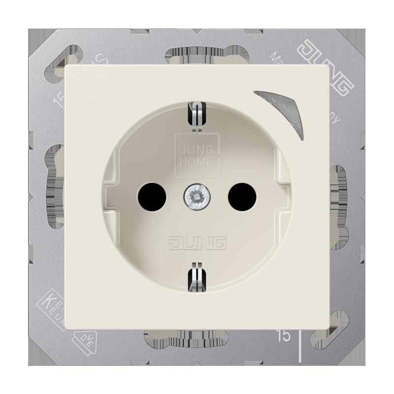 JUNG HOME Schutzkontakt® Steckdose, weiß mit integriertem erhöhten Berührungsschutz (Safety Plus) mit Schraubklemmen für starre und flexible Leiter bis 2,5 mm2 Verbindungsklemmen nach DIN VDE 0620 Tragring, Krallen und Krallenschrauben sind über eine Erdungsschiene in die Schutzmaßnahme eingebunden. Bestimmungsgemäßer Gebrauch Manuelles oder automatisches Schalten von Beleuchtung und haushaltsüblichen Geräten Drahtlose Verknüpfung mit Geräten des JUNG HOME Systems Einsatz im trockenen Innenbereich Montage in Gerätedose mit Abmessungen nach DIN 49073 Tiefe der Gerätedose (Innenmaß): min. 53 mm   Produkteigenschaften Inbetriebnahme und Bedienung über JUNG HOME App mit mobilem Endgerät (Smartphone oder Tablet) über Bluetooth® Taste zum Schalten Mehrfarbige Statusanzeige mit optionalem Nachtmodus Sperren der lokalen Bedienung Bis zu 16 Zeitprogramme Einbindung der Last in Bereiche (Gruppen), Zentralfunktionen und Szenen Automatikfunktionen aktivieren/deaktivieren über JUNG HOME App Automatische Datum- und Uhrzeitaktualisierung bei Verbindung mit Smartphone Integrierter Schaltaktor mit 16 A Bluetooth® SIG Mesh für voll verschlüsselte drahtlose Kommunikation und Repeaterfunktion Updatefähig über JUNG HOME App Zukünftig per Update verfügbar: (Hinweise zu Updates und Terminen finden sie unter jung.group/junghome) Sperr- und Zwangsführung: Dauer-EIN/AUS oder für feste Zeit EIN/AUS Zeitprogramme mit Sonnenauf- bzw. Sonnenuntergang (Astrotimer) Zeitprogramme mit Zufallszeitpunkt Ein-/ Ausschaltverzögerung Material: Thermoplast Maße (B x H): 55 x 55 mm