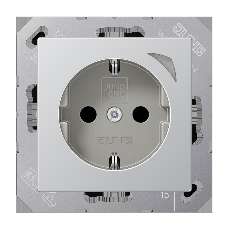 JUNG HOME Schutzkontakt® Steckdose, aluminium mit integriertem erhöhten Berührungsschutz (Safety Plus) mit Schraubklemmen für starre und flexible Leiter bis 2,5 mm2 Verbindungsklemmen nach DIN VDE 0620 Tragring, Krallen und Krallenschrauben sind über eine Erdungsschiene in die Schutzmaßnahme eingebunden. Bestimmungsgemäßer Gebrauch Manuelles oder automatisches Schalten von Beleuchtung und haushaltsüblichen Geräten Drahtlose Verknüpfung mit Geräten des JUNG HOME Systems Einsatz im trockenen Innenbereich Montage in Gerätedose mit Abmessungen nach DIN 49073 Tiefe der Gerätedose (Innenmaß): min. 53 mm   Produkteigenschaften Inbetriebnahme und Bedienung über JUNG HOME App mit mobilem Endgerät (Smartphone oder Tablet) über Bluetooth® Taste zum Schalten Mehrfarbige Statusanzeige mit optionalem Nachtmodus Sperren der lokalen Bedienung Bis zu 16 Zeitprogramme Einbindung der Last in Bereiche (Gruppen), Zentralfunktionen und Szenen Automatikfunktionen aktivieren/deaktivieren über JUNG HOME App Automatische Datum- und Uhrzeitaktualisierung bei Verbindung mit Smartphone Integrierter Schaltaktor mit 16 A Bluetooth® SIG Mesh für voll verschlüsselte drahtlose Kommunikation und Repeaterfunktion Updatefähig über JUNG HOME App Zukünftig per Update verfügbar: (Hinweise zu Updates und Terminen finden sie unter jung.group/junghome) Sperr- und Zwangsführung: Dauer-EIN/AUS oder für feste Zeit EIN/AUS Zeitprogramme mit Sonnenauf- bzw. Sonnenuntergang (Astrotimer) Zeitprogramme mit Zufallszeitpunkt Ein-/ Ausschaltverzögerung Material: Thermoplast lackiert Maße (B x H): 55 x 55 mm
