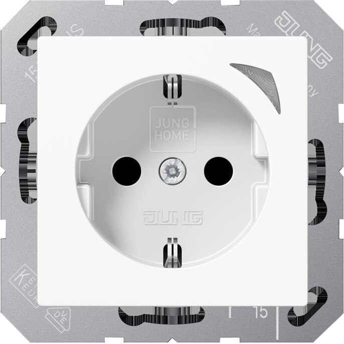 JUNG HOME Schutzkontakt® Steckdose Energy, alpinweiß mit integriertem erhöhten Berührungsschutz (Safety Plus) mit Schraubklemmen für starre und flexible Leiter bis 2,5 mm2 Verbindungsklemmen nach DIN VDE 0620 Tragring, Krallen und Krallenschrauben sind über eine Erdungsschiene in die Schutzmaßnahme eingebunden. Bestimmungsgemäßer Gebrauch Manuelles oder automatisches Schalten von Beleuchtung und haushaltsüblichen Geräten Leistungs- (W) und Energiemessung (kWh) der angeschlossenen Geräte Drahtlose Verknüpfung mit Geräten des JUNG HOME Systems Einsatz im trockenen Innenbereich Montage in Gerätedose mit Abmessungen nach DIN 49073 Tiefe der Gerätedose (Innenmaß): min. 53 mm Produkteigenschaften Inbetriebnahme und Bedienung über JUNG HOME App mit mobilem Endgerät (Smartphone oder Tablet) über Bluetooth® Taste zum Schalten Mehrfarbige Statusanzeige mit optionalem Nachtmodus Sperren der lokalen Bedienung Bis zu 16 Zeitprogramme Einbindung der Last in Bereiche (Gruppen), Zentralfunktionen und Szenen Automatikfunktionen aktivieren/deaktivieren über JUNG HOME App Automatische Datum- und Uhrzeitaktualisierung bei Verbindung mit Smartphone Integrierter Schaltaktor mit 16 A Leistungsmessung von 0,1 bis 3680 Watt und Energiemessung (kWh) Aufzeichnung des Energieverlaufes letzte 24 Stunden und letzte 31 Tage (Charting) Betriebsstundenzähler, Zeitraum der Energiemessung Power-Save-Funktion (Abschalten von Standby-Verbrauchern) Master-Slave-Funktion (abhängig vom angeschlossenen Verbraucher einen drahtlos verknüpften Verbraucher einschalten) Überstrom-Schutzabschaltung Bluetooth® SIG Mesh für voll verschlüsselte drahtlose Kommunikation und Repeaterfunktion Updatefähig über JUNG HOME App Zukünftig per Update verfügbar: (Hinweise zu Updates und Terminen finden sie unter jung.group/junghome) Sperr- und Zwangsführung: Dauer-EIN/AUS oder für feste Zeit EIN/AUS Zeitprogramme mit Sonnenauf- bzw. Sonnenuntergang (Astrotimer) Zeitprogramme mit Zufallszeitpunkt Ein-/ Ausschaltverzögerung Eingespeiste Leistung von -0,1 bis -3680 Watt und eingespeiste Energie (kWh) Material: Thermoplast Maße (B x H): 55 x 55 mm
