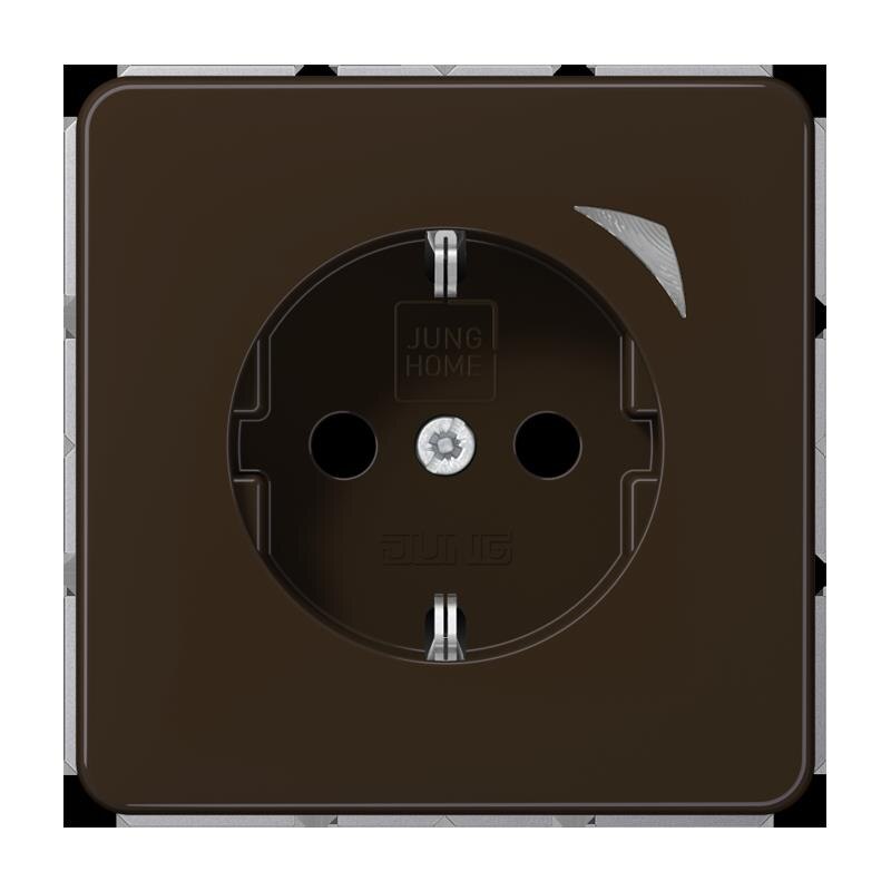 JUNG HOME Schutzkontakt® Steckdose, braun mit integriertem erhöhten Berührungsschutz (Safety Plus) mit Schraubklemmen für starre und flexible Leiter bis 2,5 mm2 Verbindungsklemmen nach DIN VDE 0620 Tragring, Krallen und Krallenschrauben sind über eine Erdungsschiene in die Schutzmaßnahme eingebunden. Bestimmungsgemäßer Gebrauch Manuelles oder automatisches Schalten von Beleuchtung und haushaltsüblichen Geräten Drahtlose Verknüpfung mit Geräten des JUNG HOME Systems Einsatz im trockenen Innenbereich Montage in Gerätedose mit Abmessungen nach DIN 49073 Tiefe der Gerätedose (Innenmaß): min. 53 mm   Produkteigenschaften Inbetriebnahme und Bedienung über JUNG HOME App mit mobilem Endgerät (Smartphone oder Tablet) über Bluetooth® Taste zum Schalten Mehrfarbige Statusanzeige mit optionalem Nachtmodus Sperren der lokalen Bedienung Bis zu 16 Zeitprogramme Einbindung der Last in Bereiche (Gruppen), Zentralfunktionen und Szenen Automatikfunktionen aktivieren/deaktivieren über JUNG HOME App Automatische Datum- und Uhrzeitaktualisierung bei Verbindung mit Smartphone Integrierter Schaltaktor mit 16 A Bluetooth® SIG Mesh für voll verschlüsselte drahtlose Kommunikation und Repeaterfunktion Updatefähig über JUNG HOME App Zukünftig per Update verfügbar: (Hinweise zu Updates und Terminen finden sie unter jung.group/junghome) Sperr- und Zwangsführung: Dauer-EIN/AUS oder für feste Zeit EIN/AUS Zeitprogramme mit Sonnenauf- bzw. Sonnenuntergang (Astrotimer) Zeitprogramme mit Zufallszeitpunkt Ein-/ Ausschaltverzögerung Material: Thermoplast Maße (B x H): 67 x 67 mm