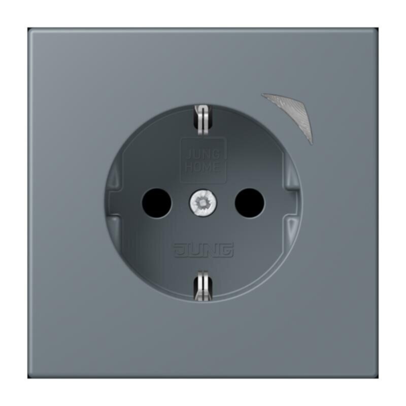 JUNG HOME Schutzkontakt® Steckdose, gris 59 mit integriertem erhöhten Berührungsschutz (Safety Plus) mit Schraubklemmen für starre und flexible Leiter bis 2,5 mm2 Verbindungsklemmen nach DIN VDE 0620 Tragring, Krallen und Krallenschrauben sind über eine Erdungsschiene in die Schutzmaßnahme eingebunden. Bestimmungsgemäßer Gebrauch Manuelles oder automatisches Schalten von Beleuchtung und haushaltsüblichen Geräten Drahtlose Verknüpfung mit Geräten des JUNG HOME Systems Einsatz im trockenen Innenbereich Montage in Gerätedose mit Abmessungen nach DIN 49073 Tiefe der Gerätedose (Innenmaß): min. 53 mm   Produkteigenschaften Inbetriebnahme und Bedienung über JUNG HOME App mit mobilem Endgerät (Smartphone oder Tablet) über Bluetooth® Taste zum Schalten Mehrfarbige Statusanzeige mit optionalem Nachtmodus Sperren der lokalen Bedienung Bis zu 16 Zeitprogramme Einbindung der Last in Bereiche (Gruppen), Zentralfunktionen und Szenen Automatikfunktionen aktivieren/deaktivieren über JUNG HOME App Automatische Datum- und Uhrzeitaktualisierung bei Verbindung mit Smartphone Integrierter Schaltaktor mit 16 A Bluetooth® SIG Mesh für voll verschlüsselte drahtlose Kommunikation und Repeaterfunktion Updatefähig über JUNG HOME App Zukünftig per Update verfügbar: (Hinweise zu Updates und Terminen finden sie unter jung.group/junghome) Sperr- und Zwangsführung: Dauer-EIN/AUS oder für feste Zeit EIN/AUS Zeitprogramme mit Sonnenauf- bzw. Sonnenuntergang (Astrotimer) Zeitprogramme mit Zufallszeitpunkt Ein-/ Ausschaltverzögerung Material: Thermoplast lackiert Maße (B x H): 70 x 70 mm